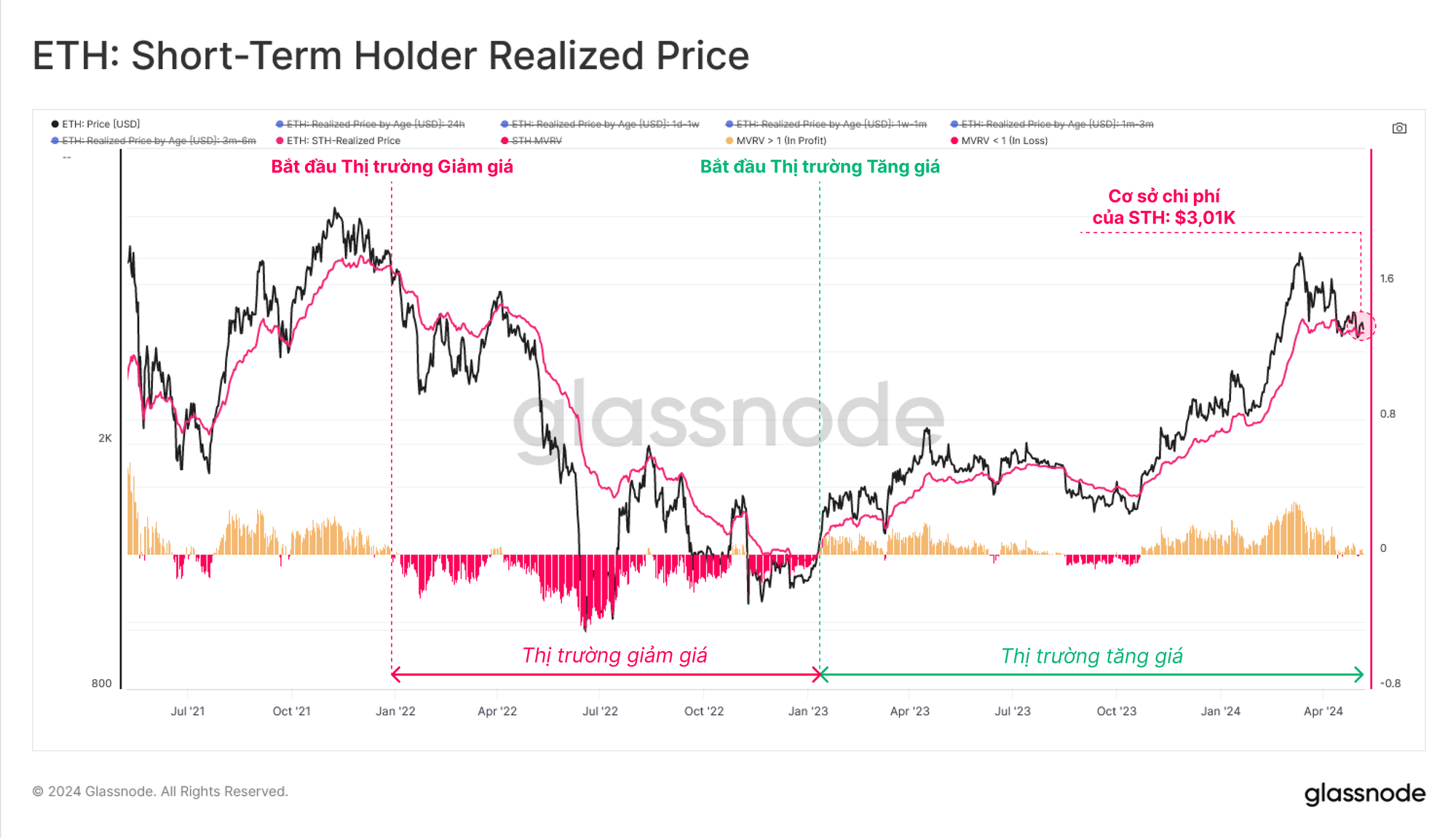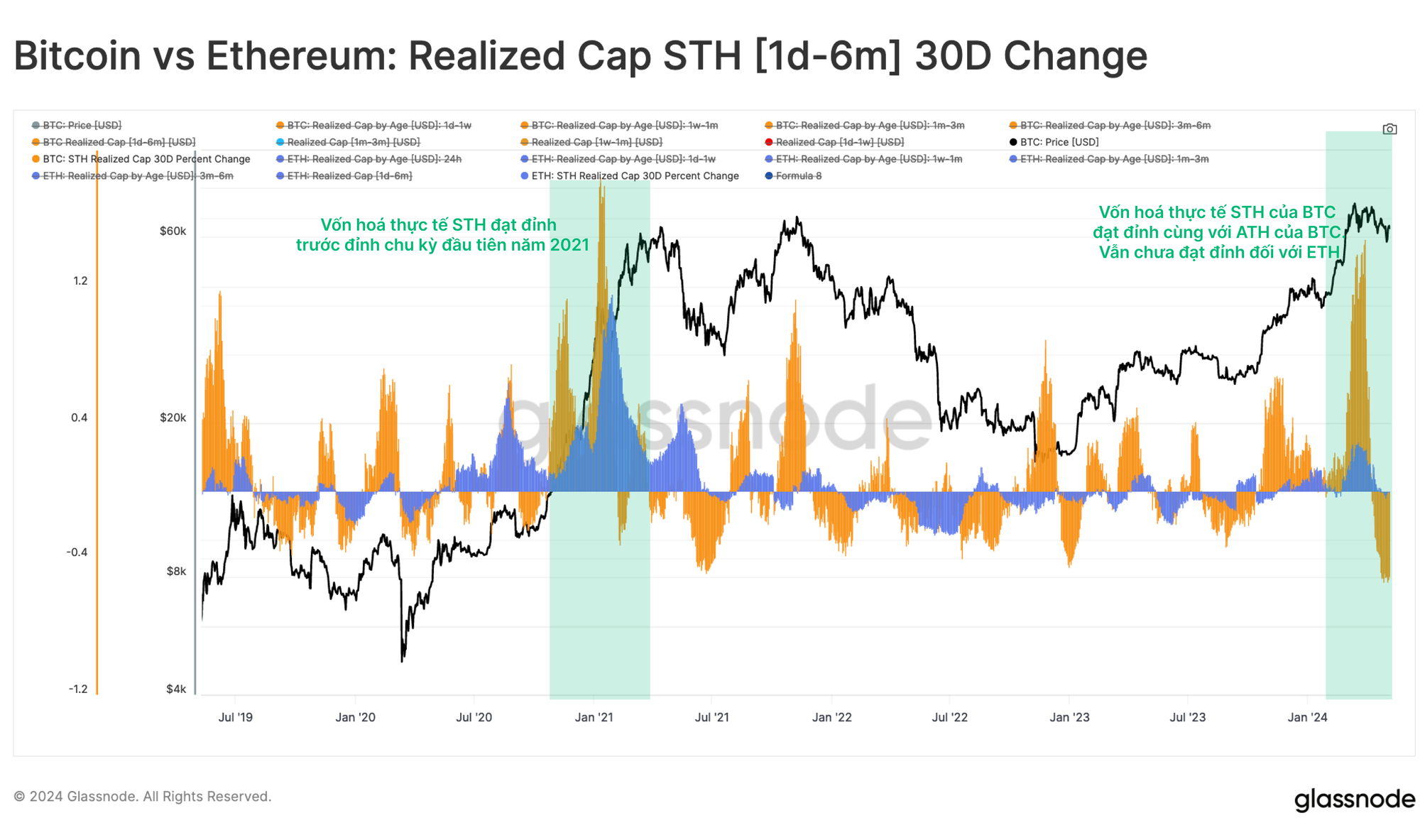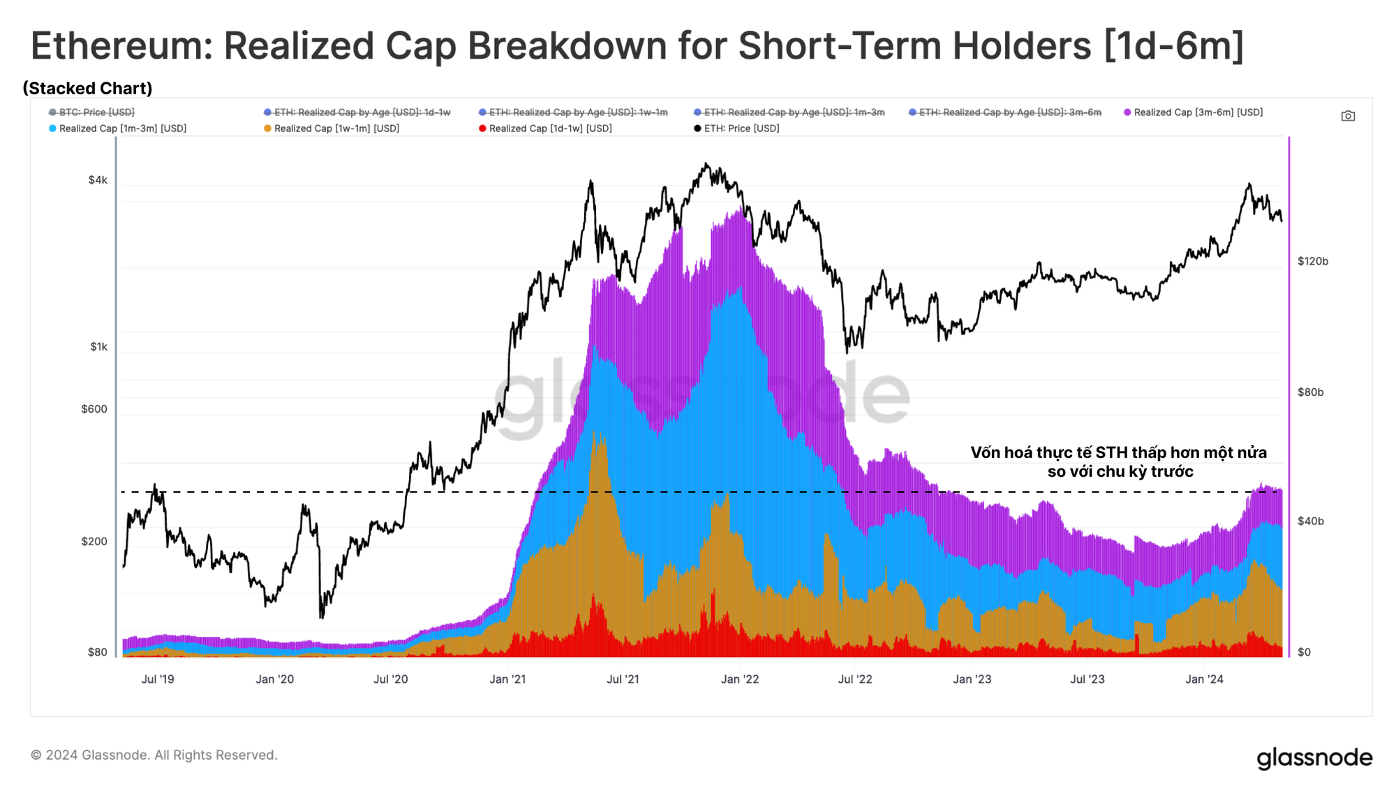 Tuy nhiên, xu hướng này chưa được phản ánh đối với ETH khi vẫn chưa chứng kiến mức giá vượt qua ATH năm 2021. Trong khi Vốn hoá thực tế STH của Bitcoin gần ngang bằng với đỉnh thị trường tăng giá gần đây nhất, thì Vốn hoá thực tế STH của ETH hầu như không thoát khỏi mức đáy, cho thấy sự mờ nhạt của dòng vốn mới.