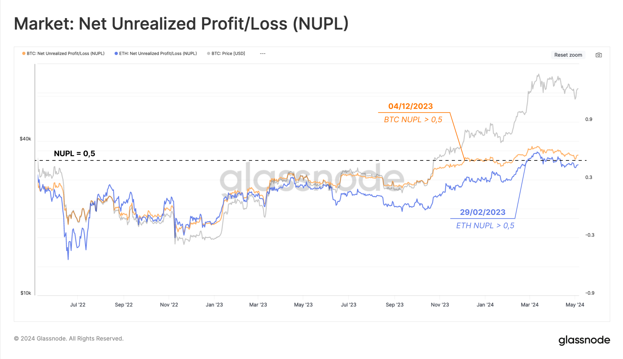 Giữa sự phấn khích và phục hồi của thị trường quanh việc phê duyệt các quỹ ETF Bitcoin giao ngay, lợi nhuận chưa thực hiện của những người nắm giữ Bitcoin đã tăng nhanh hơn một cách đáng kể so với các nhà đầu tư Ethereum. Do đó, chỉ số NUPL của Bitcoin đã vượt qua 0,5 và tiến vào giai đoạn hưng phấn trước ba tháng so với chỉ số tương đương của Ethereum.