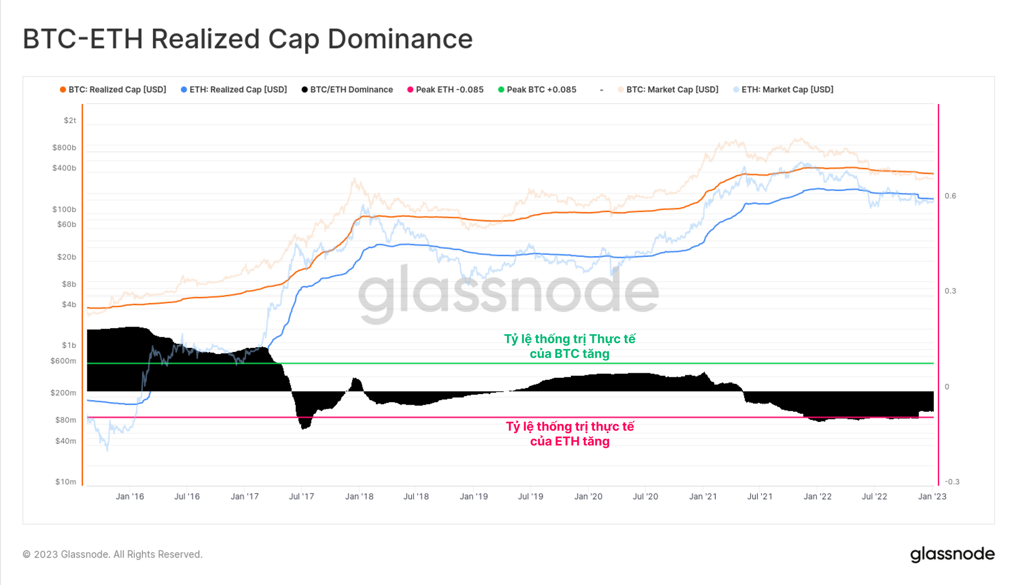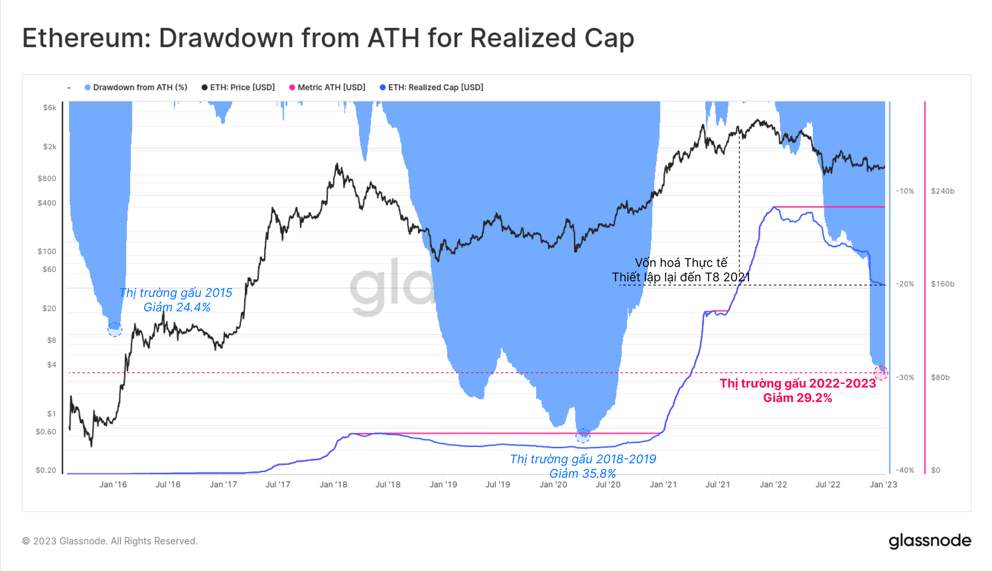 Vốn hóa thực tế của Ethereum đã giảm 29.2% kể từ ATH được thiết lập vào tháng 1 năm 2022. Các nhà đầu tư Ether đã chốt lỗ tổng cộng 67.1 tỷ đô trong suốt năm 2022.