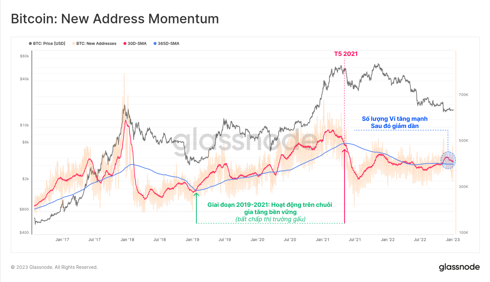 Chuyển trọng tâm sang các hoạt động trên chuỗi, chúng ta có thể thấy rằng một đợt bùng nổ ngắn hạn các địa chỉ Bitcoin mới đã xảy ra sau sự sụp đổ của FTX, nhưng sau đó đã giảm nhiệt rõ rệt. Mức trung bình hàng tháng 🔴 của Địa chỉ mới đang quay trở lại mức cơ sở trung bình hàng năm 🔵, cho thấy vẫn chưa có sự phục hồi thuyết phục và bền vững trong việc sử dụng mạng.
