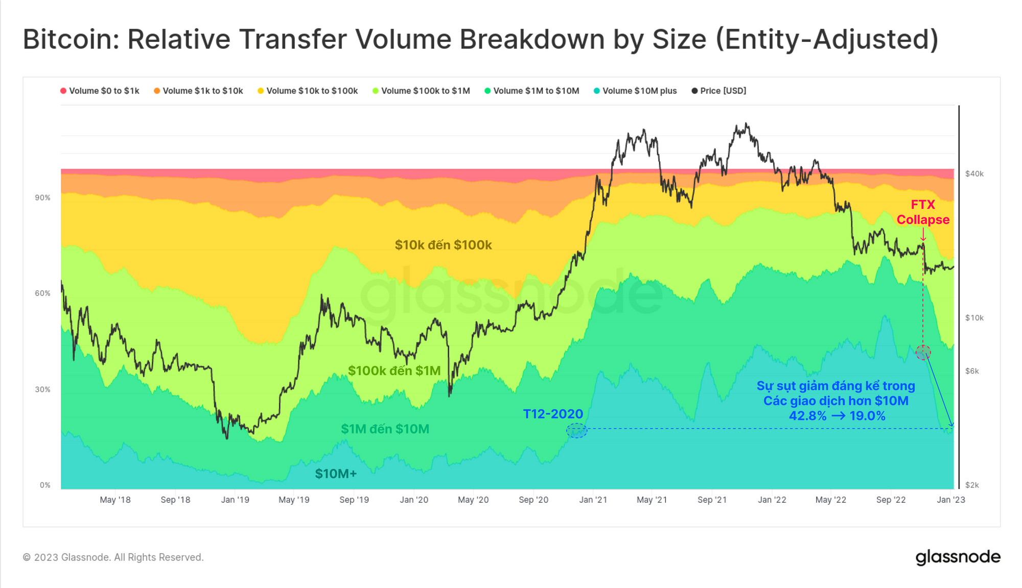 Chúng ta có thể thấy điều này trong bảng phân tích tương đối về khối lượng chuyển khoản, trong đó sự thống trị của các giao dịch có quy mô từ 10 triệu đô trở lên là nguyên nhân chính dẫn đến sự suy giảm này. Chuyển khoản quy mô lớn đã giảm từ mức thống trị 42.8%, trước khi FTX sụp đổ, xuống còn 19% hiện nay.