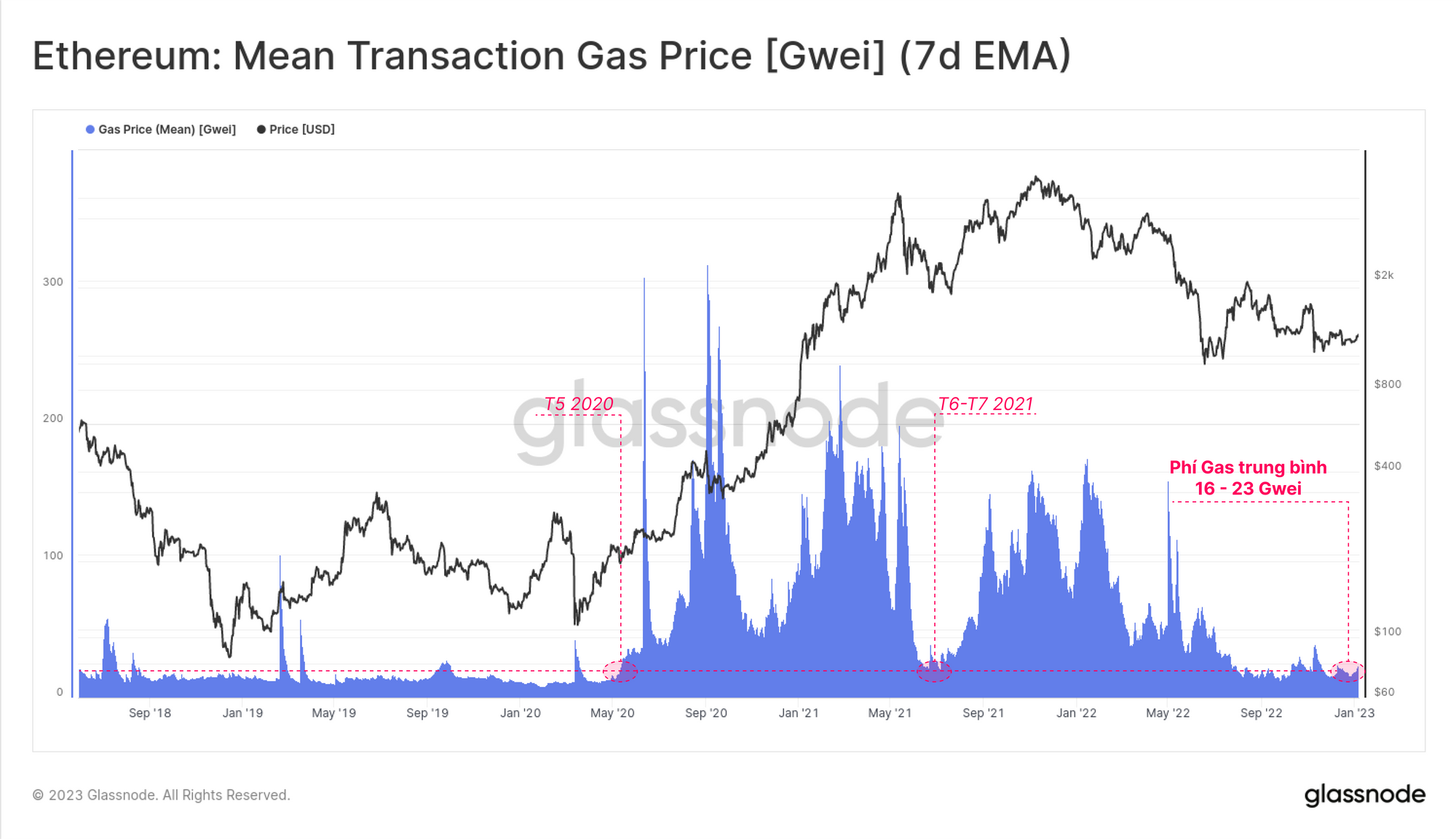 Bitcoin không phải là mạng lưới duy nhất trải nghiệm việc sử dụng trên chuỗi cực kỳ yếu này. Phí gas trung bình được trả trên chuỗi Ethereum vẫn ở gần mức thấp nhất trong chu kỳ. Phí trung bình kể từ tháng 9 dao động trong khoảng từ 16 đến 23 Gwei, mức được nhìn thấy lần cuối trong giai đoạn tháng 6 đến tháng 7 năm 2021 và tháng 5 năm 2020 ngay sau cơn hoảng loạn của thị trường do COVID.