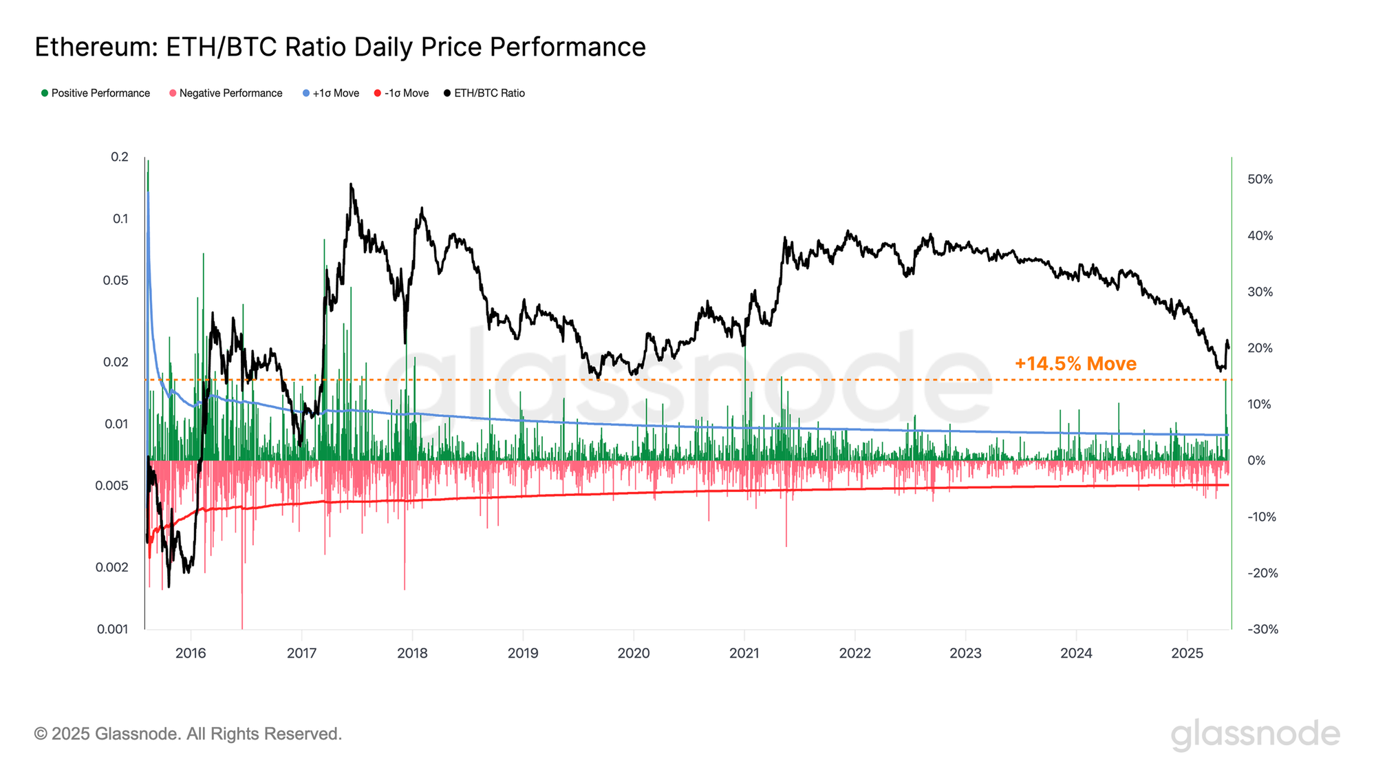 Hiệu suất vượt trội gần đây của Ethereum đã dẫn đến sự hồi sinh của Tỷ lệ ETH/BTC, với tỷ lệ này tăng tốc lên giá trị 0,026, tăng 14,5%, là sự tăng trưởng lớn thứ 46 được ghi nhận.