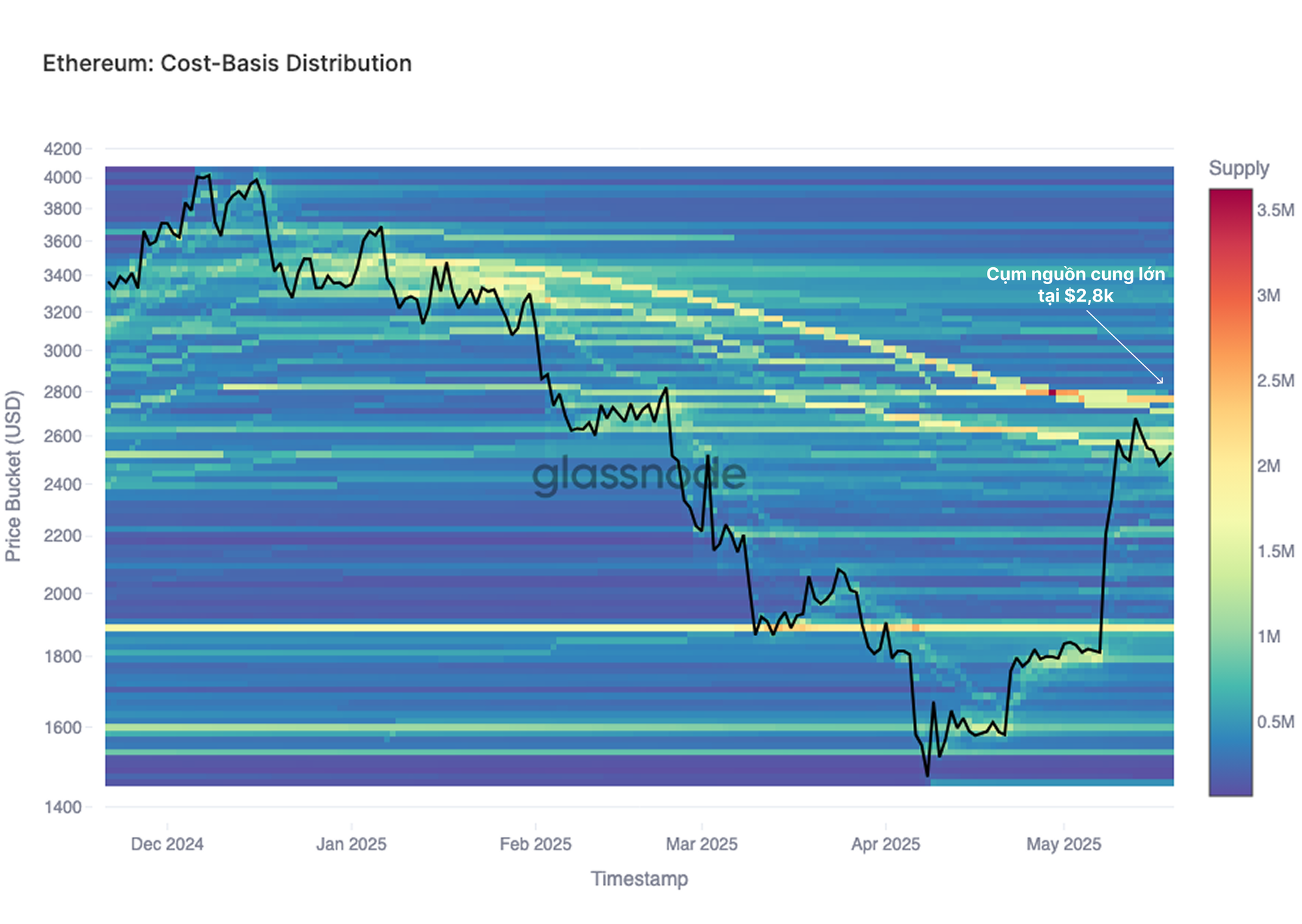 Chúng tôi có thể quan sát thấy sự hợp lưu khi xem xét lịch sử Phân phối theo Chi phí Cơ sở của Ethereum. Hiện tại, có sự tập trung đáng kể các mức cơ sở chi phí quanh $2.800. Khu vực này có khả năng sẽ thu hút nhiều áp lực bán ra, vì các nhà đầu tư đã mua và thua lỗ tại mức này có thể tìm cách giảm rủi ro ở gần mức hòa vốn của họ và rút về một phần vốn.