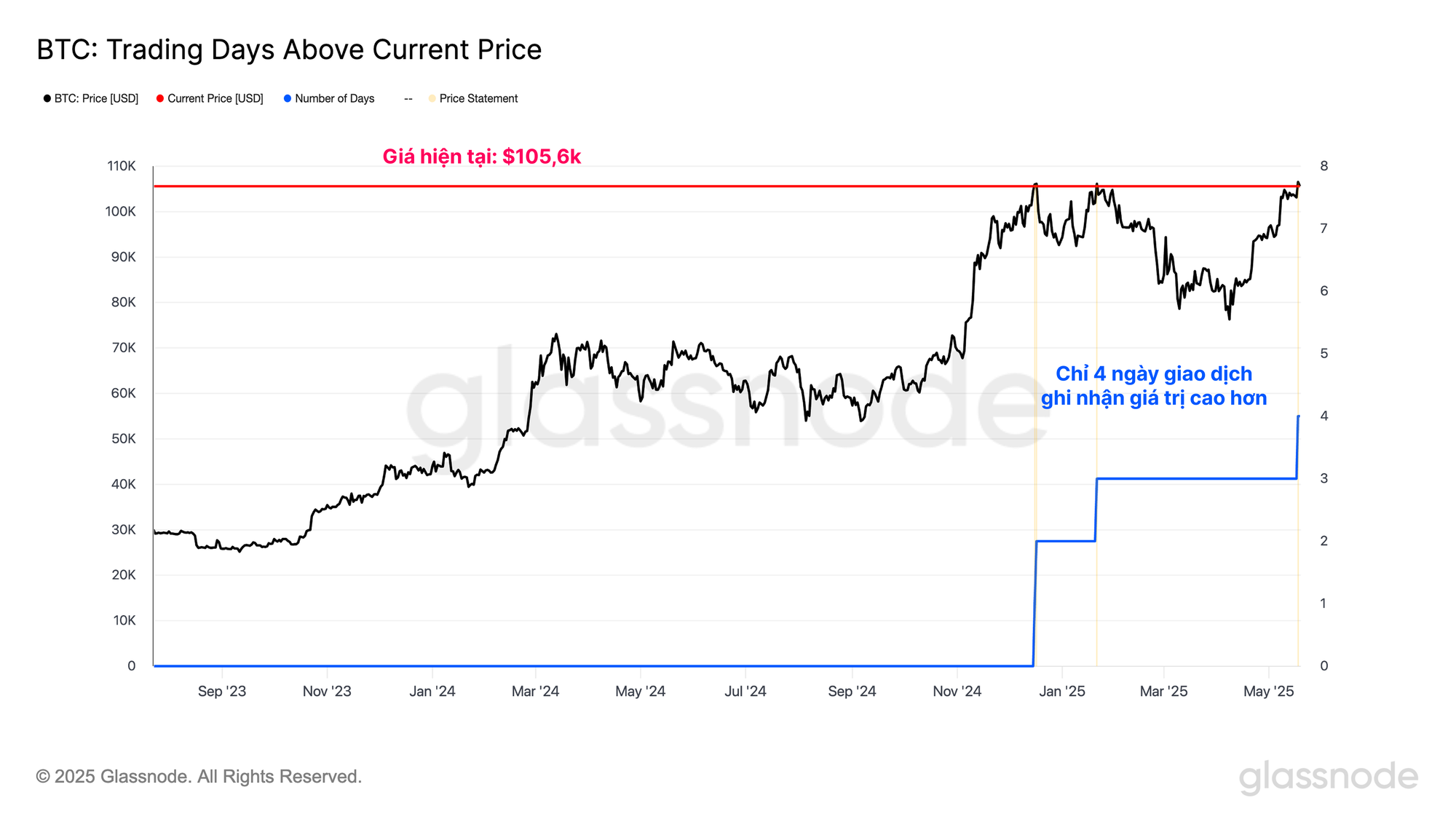 Cho đến nay, chỉ có 4 ngày giao dịch từng ghi nhận giá đóng cửa Bitcoin hàng ngày cao hơn và mức đóng cửa hàng tuần gần nhất tại $106,5k là mức cao nhất trong lịch sử. Bitcoin cũng đang giao dịch cao hơn khoảng 40% trong sáu tuần qua, cho thấy sự phục hồi mạnh mẽ của thị trường.