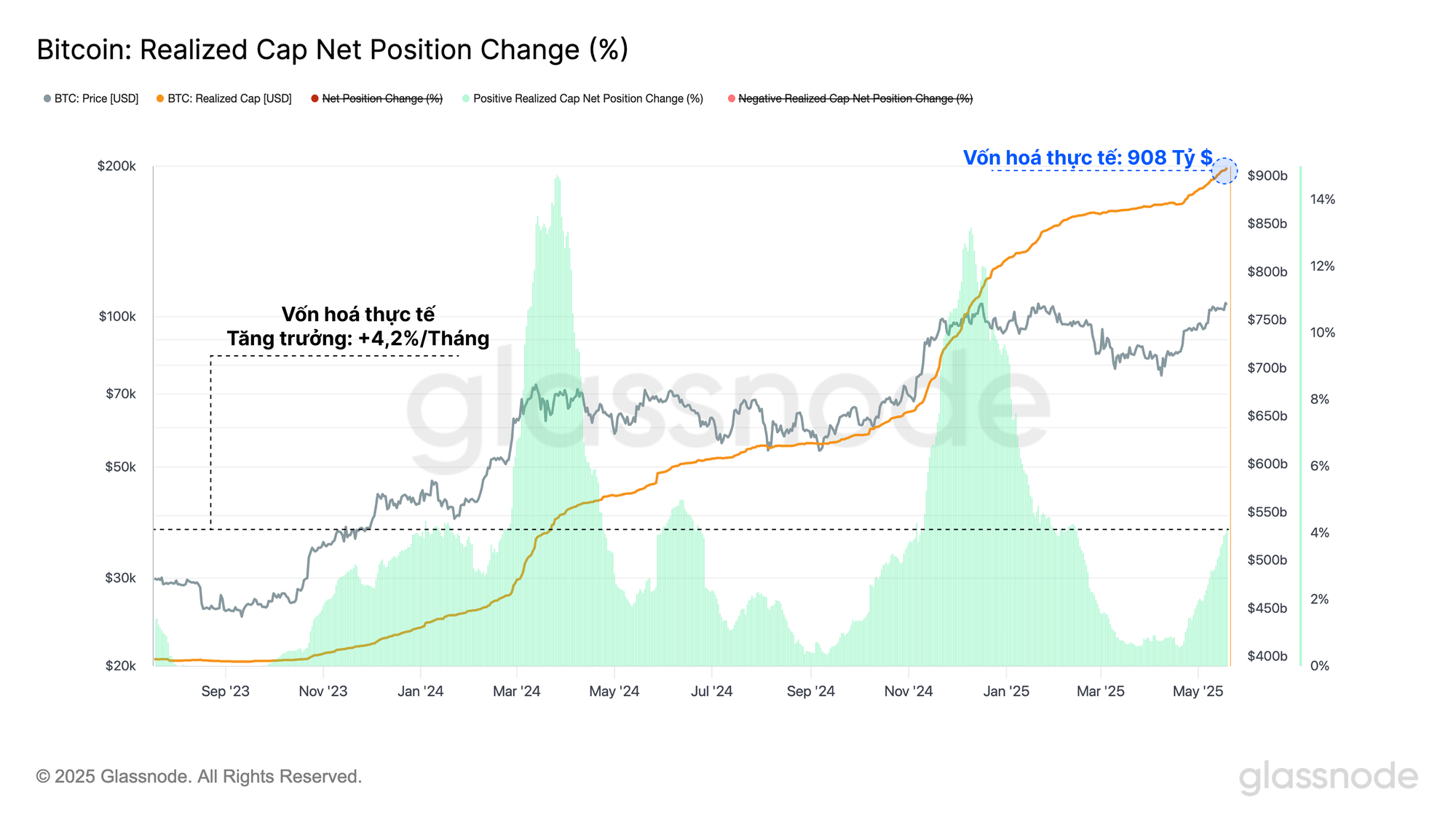 Một cách để định lượng sự thay đổi trong cán cân cung cầu này là thông qua số liệu Vốn hoá thực tế, tổng hợp dòng vốn ròng tích lũy vào một tài sản kỹ thuật số. Trong tháng qua, tổng giá trị được lưu trữ trong mạng lưới Bitcoin đã tăng +4,2%, phản ánh sự gia tăng đáng kể về dòng vốn chảy vào thị trường.