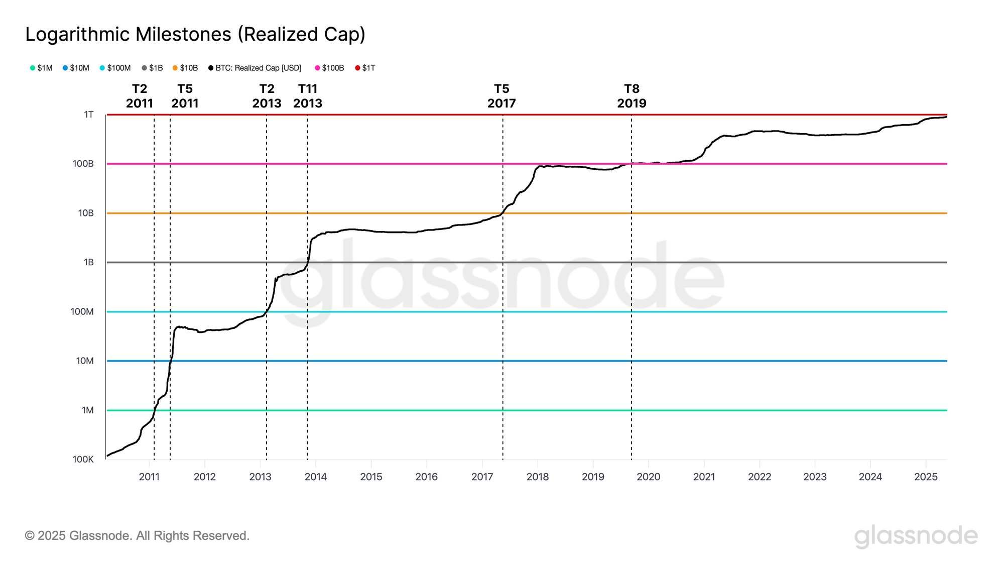 Trong khoảng thời gian từ năm 2011 đến năm 2013, vốn hóa thực tế đã tăng từ 1 triệu USD lên hơn 1 tỷ USD, vượt qua bốn cột mốc logarit trong khoảng thời gian 2 năm. Bitcoin là một tài sản nhỏ hơn nhiều so với hiện nay và đã trải qua sự tăng trưởng theo cấp số nhân trong giai đoạn khởi động ban đầu của mạng lưới. Mốc quan trọng tiếp theo cần ba năm rưỡi trước khi Vốn hóa thực tế đạt 10 tỷ USD vào giữa năm 2017.