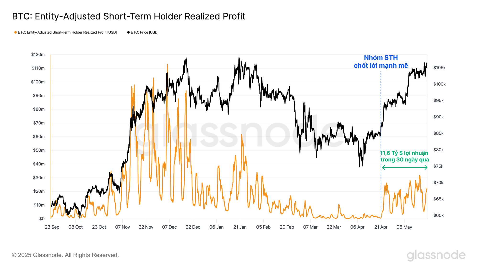Trong 30 ngày qua, chúng tôi đã chứng kiến tổng cộng 11,4 tỷ USD lợi nhuận tích lũy được hiện thực hoá bởi Người nắm giữ ngắn hạn. Để so sánh, trong giai đoạn 30 ngày trước đó, chỉ có 1,2 tỷ USD lợi nhuận, cho thấy mức độ phục hồi mạnh mẽ trong tâm lý nhà đầu tư mới và hành vi chi tiêu.