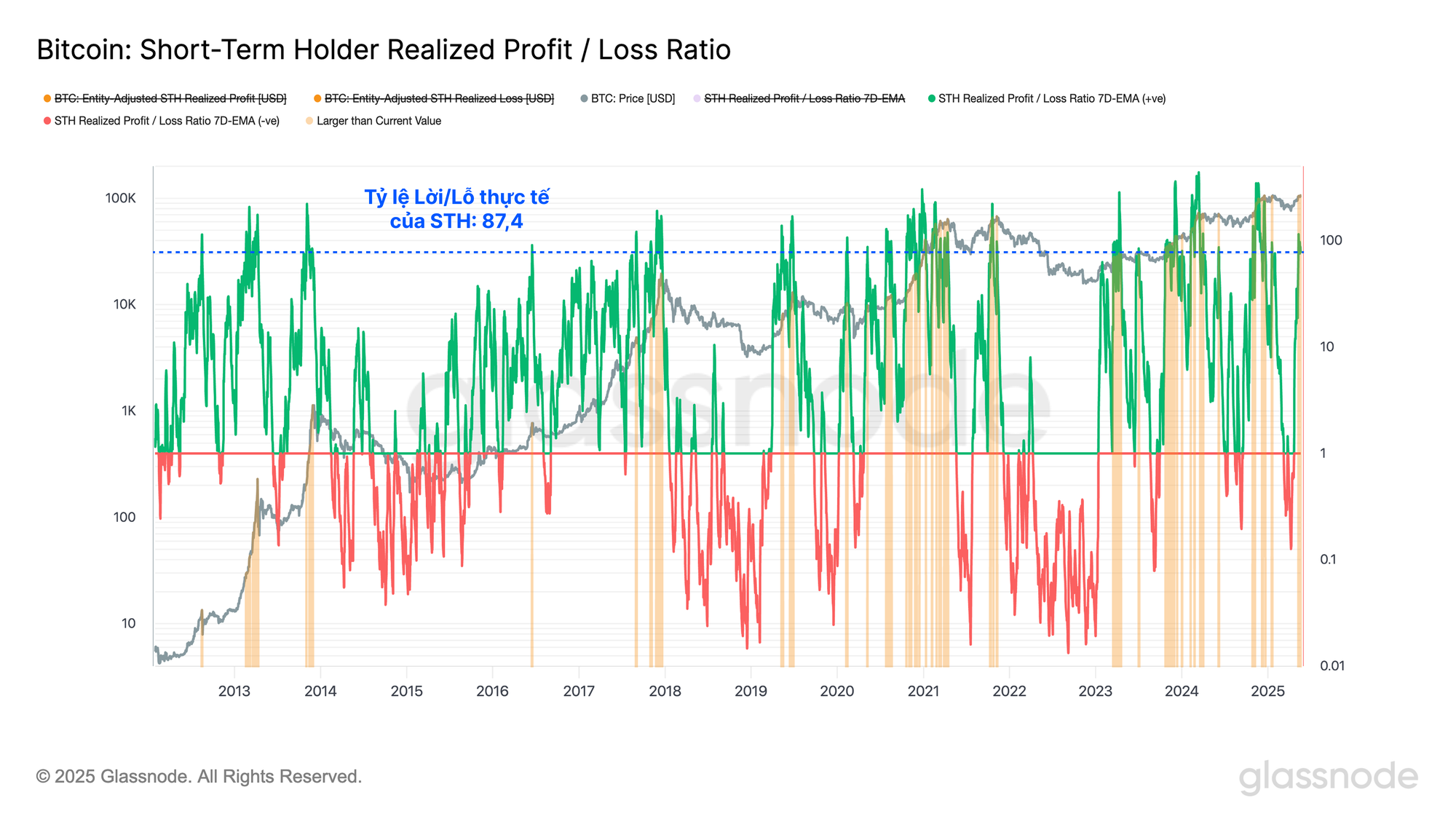 Sự thay đổi này đã gây ra một sự gia tăng đột biến trong Tỷ lệ Lợi nhuận/Thua lỗ Thực tế của Người nắm giữ Ngắn hạn. Khối lượng lợi nhuận thực tế của Người nắm giữ Ngắn hạn hiện vượt xa các khoản lỗ thực tế, chỉ có 8% số ngày giao dịch chứng kiến Tỷ lệ Lợi nhuận/Thua lỗ ở mức cao hơn.