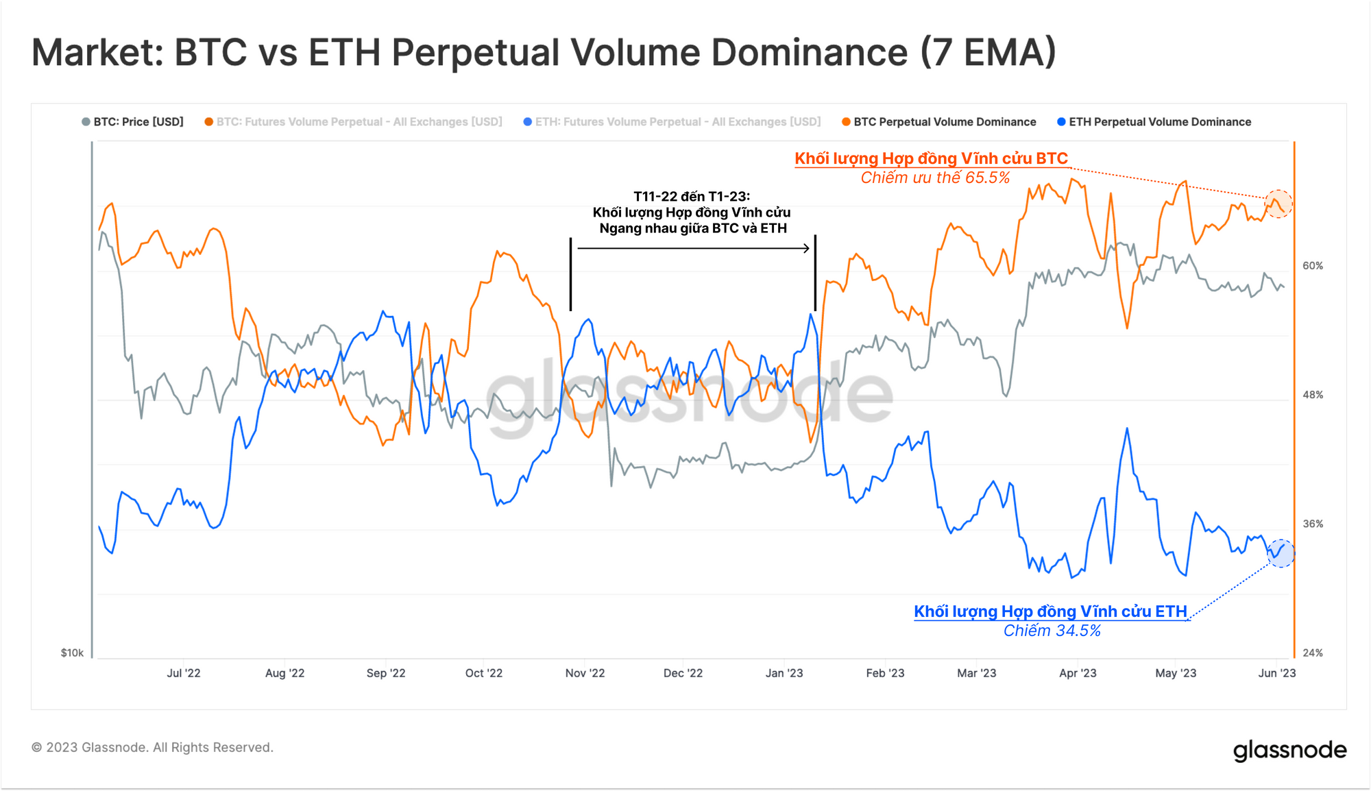 Chúng ta có thể thấy một xu hướng hỗ trợ trong sự thống trị về khối lượng tương đối giữa BTC và ETH trên thị trường hoán đổi vĩnh cửu. Trong khi khối lượng giao dịch giữa cả hai tài sản đạt mức ngang nhau vào cuối năm 2022, thì tỷ trọng tương đối của Ethereum trong khối lượng hợp đồng tương lai đã giảm mạnh vào năm 2023.