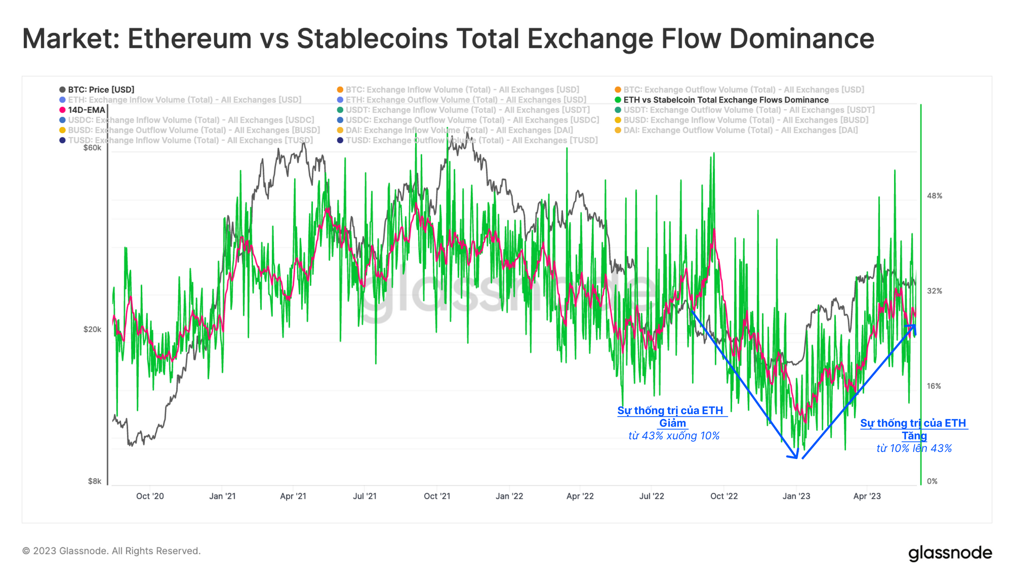 Dữ liệu on-chain cung cấp một cái nhìn khác về dòng vốn và sự luân chuyển vốn trong thị trường tiền mã hóa. Biểu đồ bên dưới so sánh tổng giá trị của ETH theo USD so với stablecoin chảy vào và ra khỏi các sàn giao dịch. Trong quá trình thanh lý lớn vào năm 2022, sở thích của nhà đầu tư đã thay đổi đáng kể, với sự thống trị của ETH trong dòng vốn giảm từ ~35% xuống 10%.