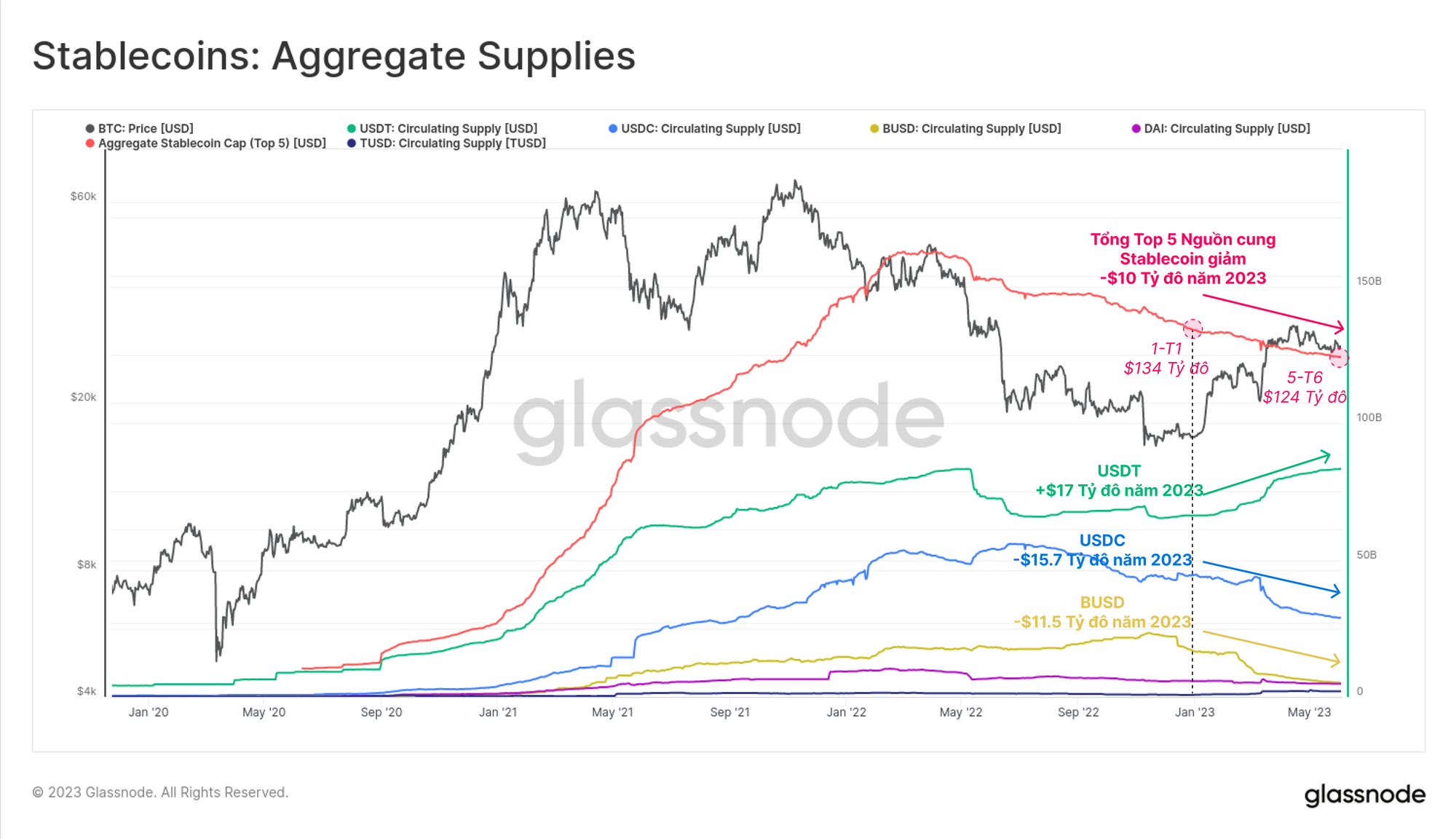 Dòng vốn chảy ra từ stablecoin gần đây được thúc đẩy chủ yếu bởi tài sản lớn thứ hai (USDC) và thứ ba (BUSD), khiến nguồn cung năm 2023 giảm lần lượt là -15.7 tỷ đô la và -11.5 tỷ đô la. USDT đã hấp thụ một tỷ lệ đáng kể các dòng vốn này, đẩy nguồn cung đạt ATH mới là 83.1 tỷ đô la.