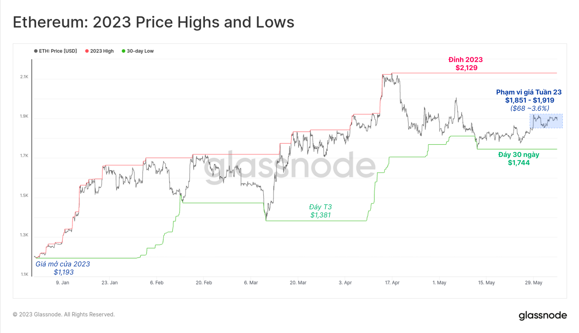 Sự yên ắng vẫn tồn tại trên các thị trường tài sản kỹ thuật số, với giá ETH dao động giới hạn trong phạm vi $68 đô la trong tuần này (3.6%), giao dịch giữa mức thấp nhất là $1,861 đô la và mức cao nhất là $1,931 đô la. Ngoài việc tăng giá nhẹ sau nâng cấp Shanghai, giá ETH gần như không đổi kể từ giữa tháng Ba.