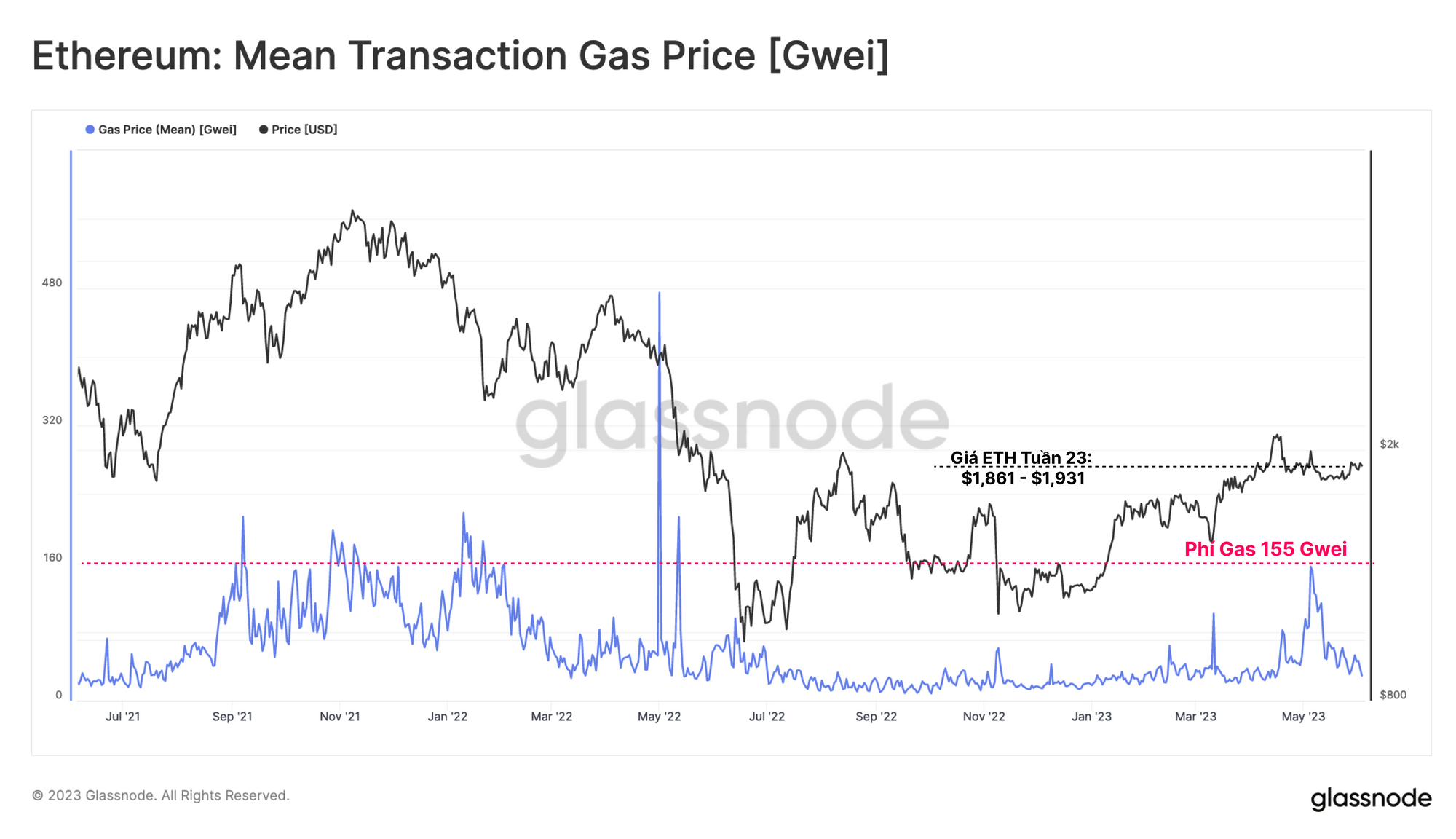 Trong khi giá ETH vẫn tương đối ổn định và giao dịch trong một phạm vi giới hạn kể từ tháng 3, phí gas đã trải qua một đợt tăng không hề nhỏ trong tháng 5. Phí gas trung bình đã tăng lên mức 76 Gwei, tương đương $1.14 đô la cho một giao dịch chuyển ETH thông thường. Phí gas trung bình đạt hơn 155 Gwei vào đầu tháng 5 ($6.53 đô la cho mỗi lần chuyển ETH), gần bằng mức phí trong chu kỳ tăng giá 2021-22.