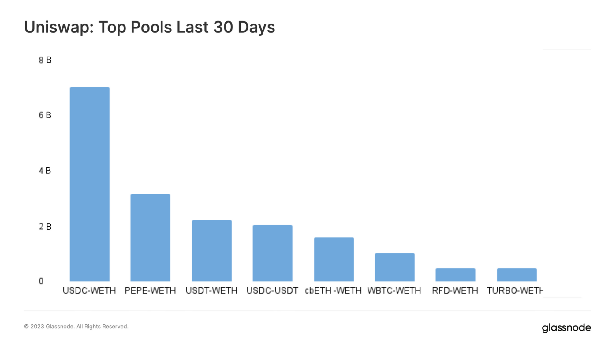 Biểu đồ bên dưới hiển thị các pool được giao dịch hàng đầu trên Uniswap, cho thấy khối lượng cao nhất trong 30 ngày qua chủ yếu liên quan đến các tài sản có giá trị vốn hóa thị trường lớn hơn như ETH, các đồng ổn định, WBTC và token phái sinh cbETH của Coinbase.