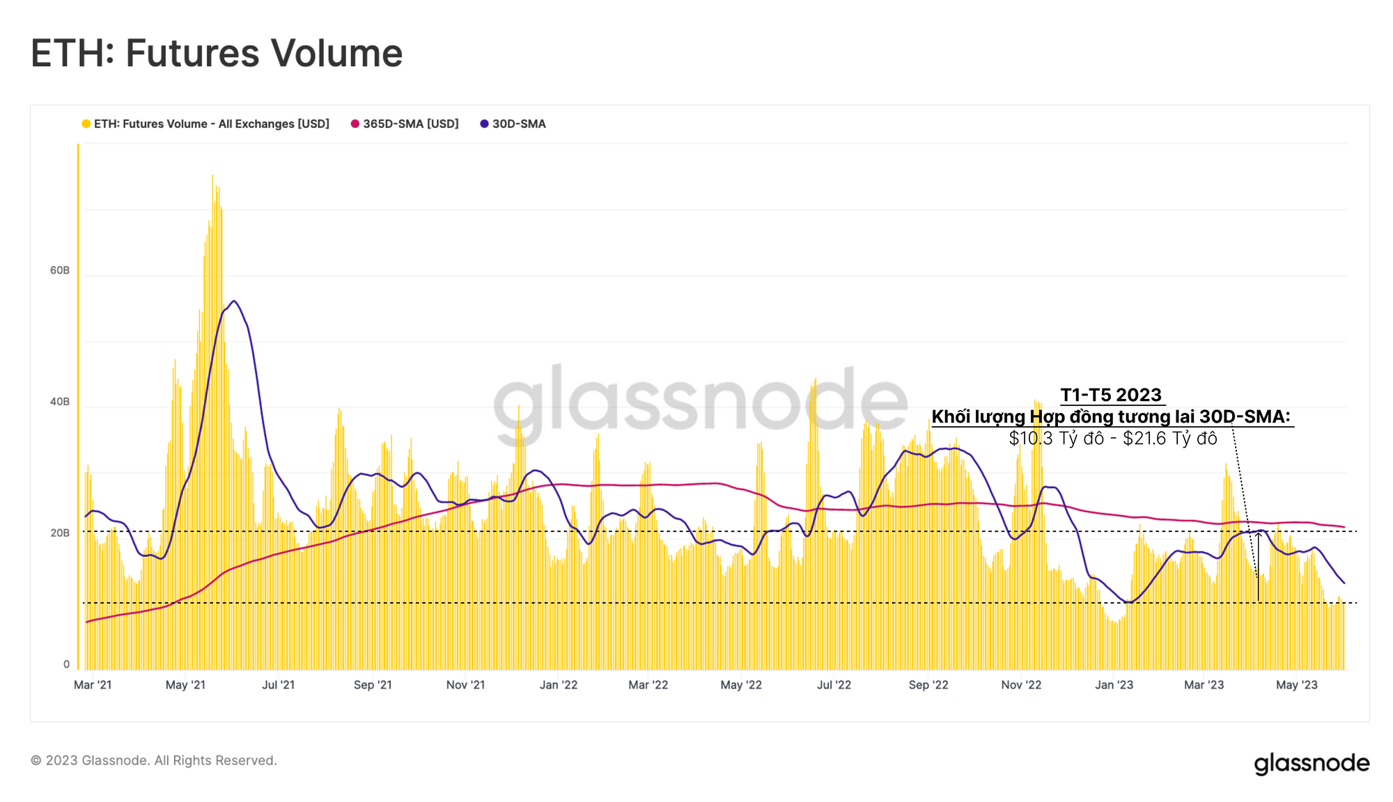 Sau sự sụp đổ của FTX, khối lượng giao dịch hợp đồng tương lai đã giảm xuống chỉ còn ~7.5 tỷ đô la/ngày. Khối lượng đã tăng trở lại vào năm 2023, tuy nhiên, mức trung bình trong 30 ngày (12 tỷ đô la/ngày) vẫn thấp hơn nhiều so với mức trung bình hàng năm (21.5 tỷ đô la/ngày).