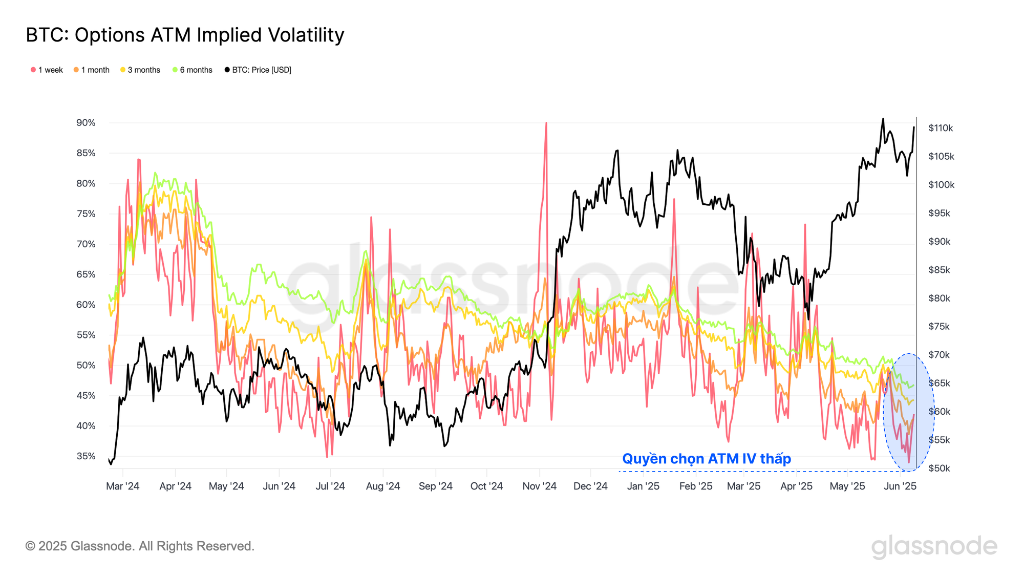 Đồng thời, biến động ngụ ý đang bắt đầu tăng lên, do sự tập trung dày đặc của nguồn cung BTC gần với giá giao ngay hiện tại. Sự tập trung này làm tăng độ nhạy cảm của thị trường đối với biến động giá. Tuy nhiên, Biến động ngụ ý Quyền chọn theo giá thị trường (ATM IV) trên tất cả các kỳ hạn chính vẫn ở mức thấp trong lịch sử, cho thấy các nhà giao dịch quyền chọn có thể đang định giá thấp khả năng thay đổi chế độ biến động.