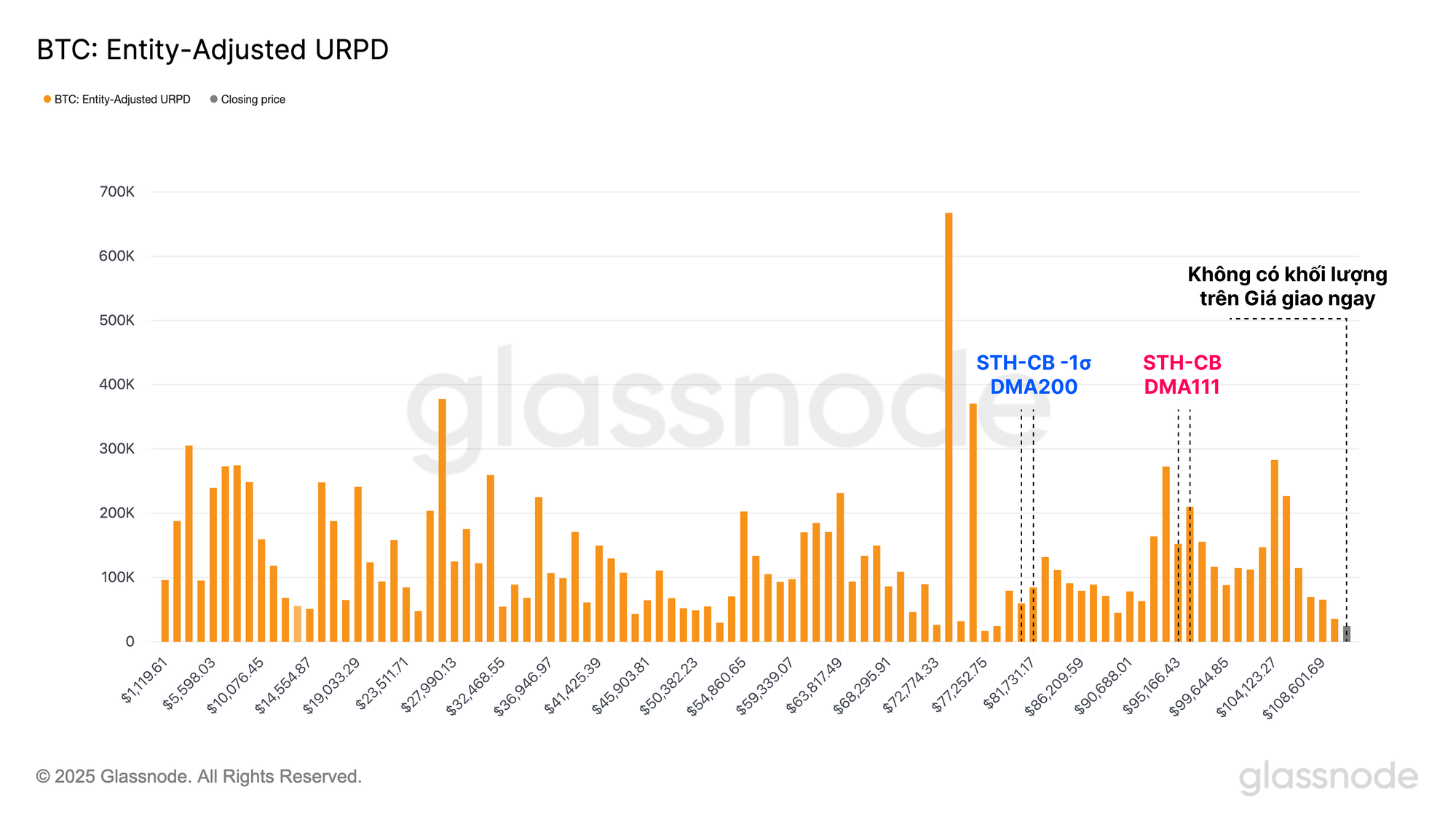 Hiện tại, Bitcoin đang nằm ở rìa trên của một cụm nguồn cung dày đặc, với khối lượng on-chain tương đối thưa thớt nằm ở phía trên. Khi giá đi vào vùng khoảng không này, nơi ít BTC hơn được giao dịch trong lịch sử, động lực thị trường phụ thuộc vào sức mạnh của nguồn cầu. Để duy trì xu hướng tăng và tiến vào quá trình khám phá giá, áp lực tăng giá phải vượt trội một cách dứt khoát so với mọi kháng cự đến từ áp lực bán.
