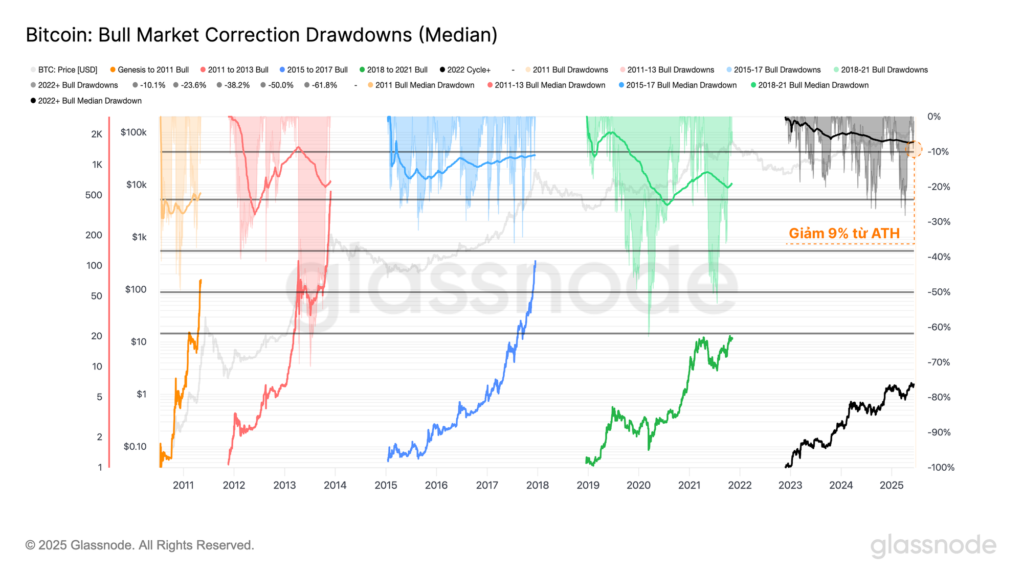 Khi đo lường sự điều chỉnh theo tỷ lệ phần trăm từ ATH, sự điều chỉnh chỉ là -9%, với 384 trong số 928 ngày giao dịch của chu kỳ này trải qua sự sụt giảm lớn hơn (41,4%). Sự sụt giảm này cũng phù hợp chặt chẽ với mức sụt giảm trung vị của chu kỳ là 7%. Điều này cho thấy rằng, từ góc độ giá, mức độ nghiêm trọng của đợt giảm giá về cơ bản là phù hợp với hành vi thị trường điển hình trong chu kỳ này.