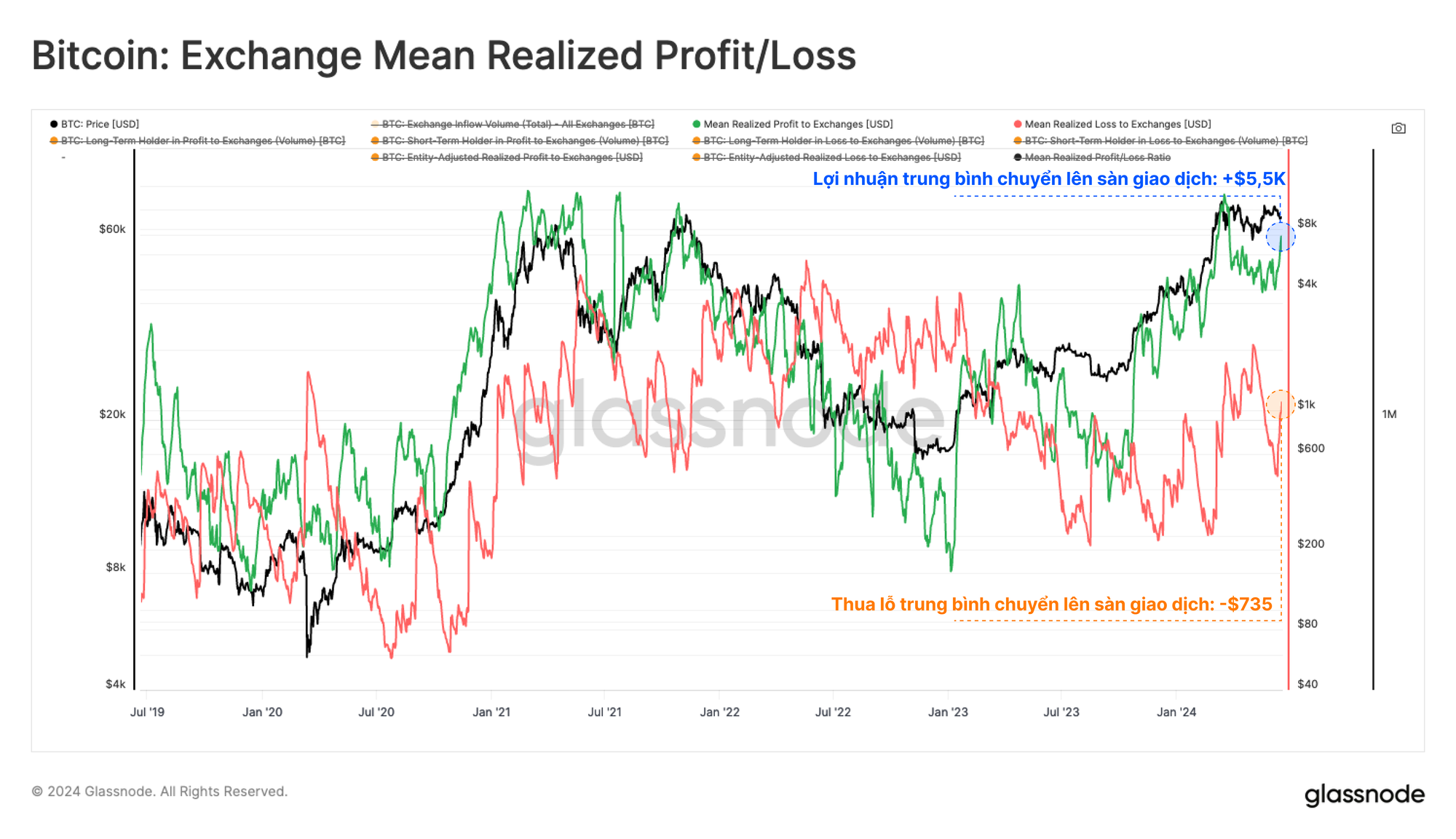 Hiện tại, một BTC trung bình được gửi lên sàn giao dịch để hiện thực hoá lợi nhuận là khoảng +$5.5k và chốt lỗ là -$735. Nghĩa là lợi nhuận trung bình lớn hơn 7,5 lần so với thua lỗ và chỉ 14,5% số ngày giao dịch ghi nhận giá trị cao hơn.