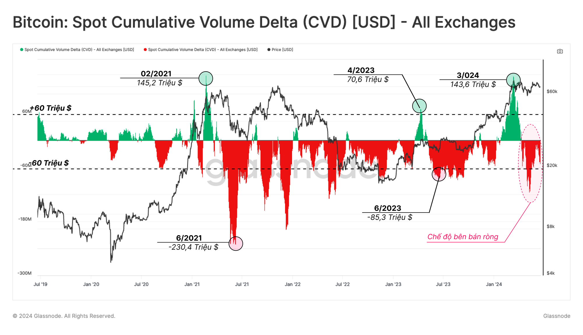 Một công cụ khác cho phép chúng tôi mô tả đặc điểm thị trường giao ngay là Spot Cumulative Volume Delta (CVD). Số liệu này mô tả độ lệch ròng trong khối lượng mua so với bán của người mua trên thị trường, được đo bằng USD.