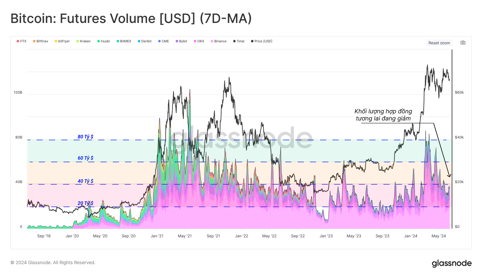 Trái ngược với lượng hợp đồng mở ngày càng tăng, khối lượng giao dịch hợp đồng tương lai đã trải qua sự suy giảm tương tự đối với thị trường giao ngay và khối lượng chuyển nhượng on-chain. Điều này cho thấy nhu cầu đầu cơ tương đối nhẹ và sự thống trị cao hơn từ các vị thế giao dịch chênh lệch giá và giao dịch theo kiểu đặt lệnh và quên đi.