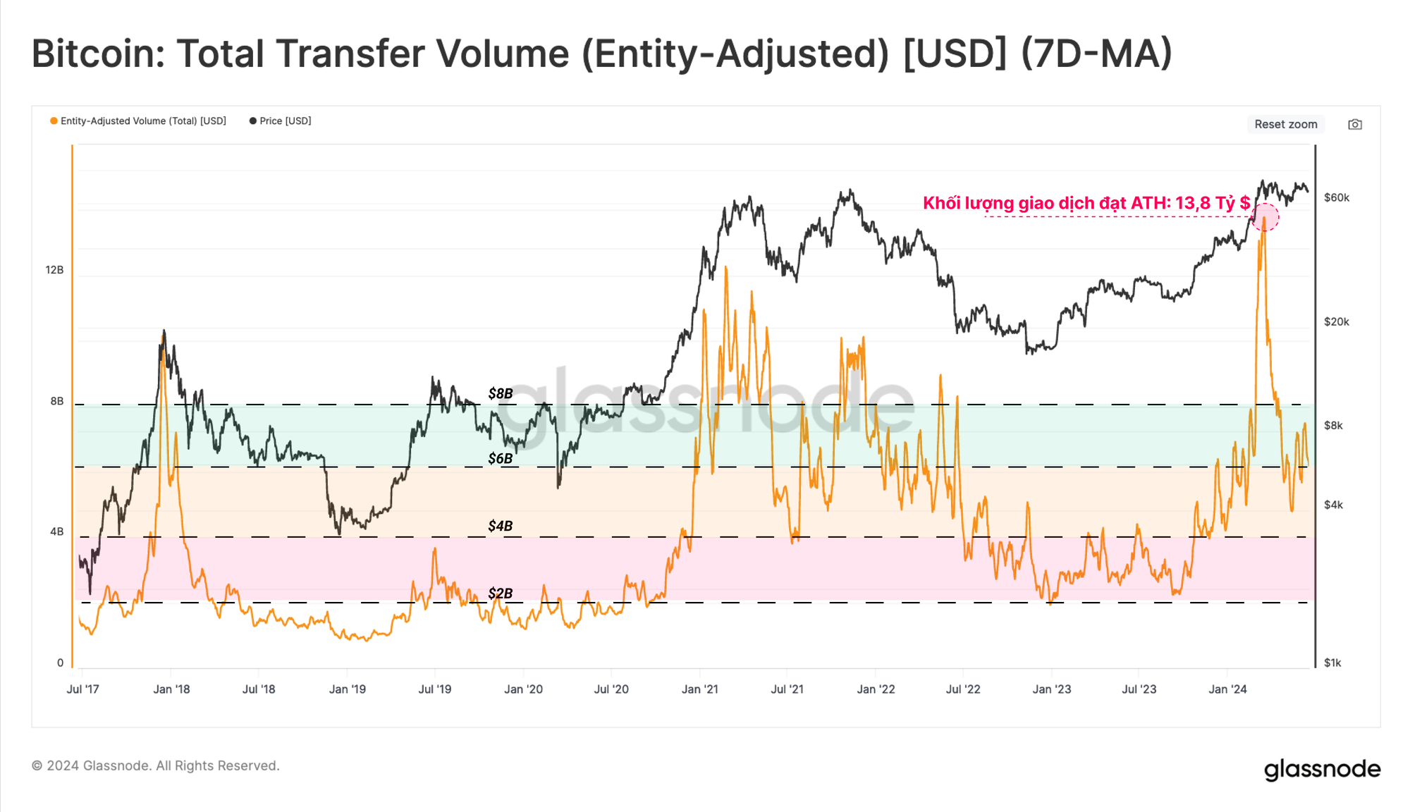 Bất chấp lợi nhuận lành mạnh của nhà đầu tư, mức độ khối lượng được xử lý và chuyển giao trên mạng Bitcoin sau ATH đã giảm đáng kể. Điều này nhấn mạnh nhu cầu đầu cơ đã giảm và sự thiếu quyết đoán ngày càng tăng trên thị trường.