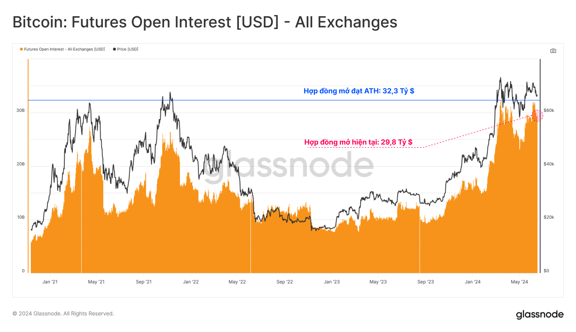 Đánh giá thị trường hợp đồng tương lai, chúng tôi ghi nhận sự gia tăng liên tục của các hợp đồng mở, hiện đã trên 30 tỷ USD và chỉ kém mức ATH trước đó. Tuy nhiên, như đã nhấn mạnh trong WoC-24, một phần đáng kể của lượng hợp đồng mở này có liên quan đến giao dịch cơ sở trung lập thị trường cash-and-carry.