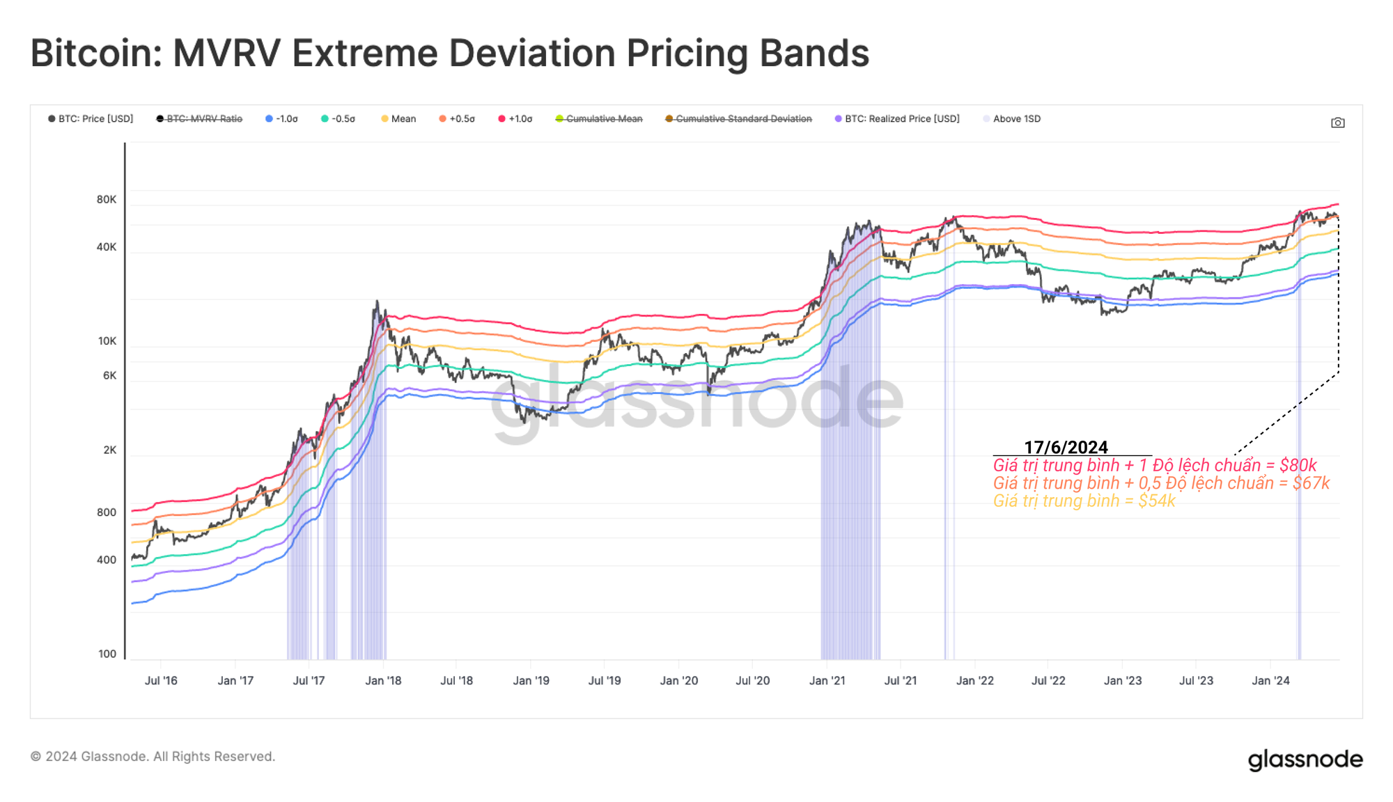 Chúng ta có thể sử dụng Tỷ lệ MVRV để xác định các khoảng giá nhằm đánh giá các giai đoạn có sự chênh lệch cực lớn về lợi nhuận của nhà đầu tư so với mức trung bình dài hạn. Trong lịch sử, các đột phá trên độ lệch chuẩn 1 thường liên kết với sự hình thành đỉnh vĩ mô dài hạn hơn.