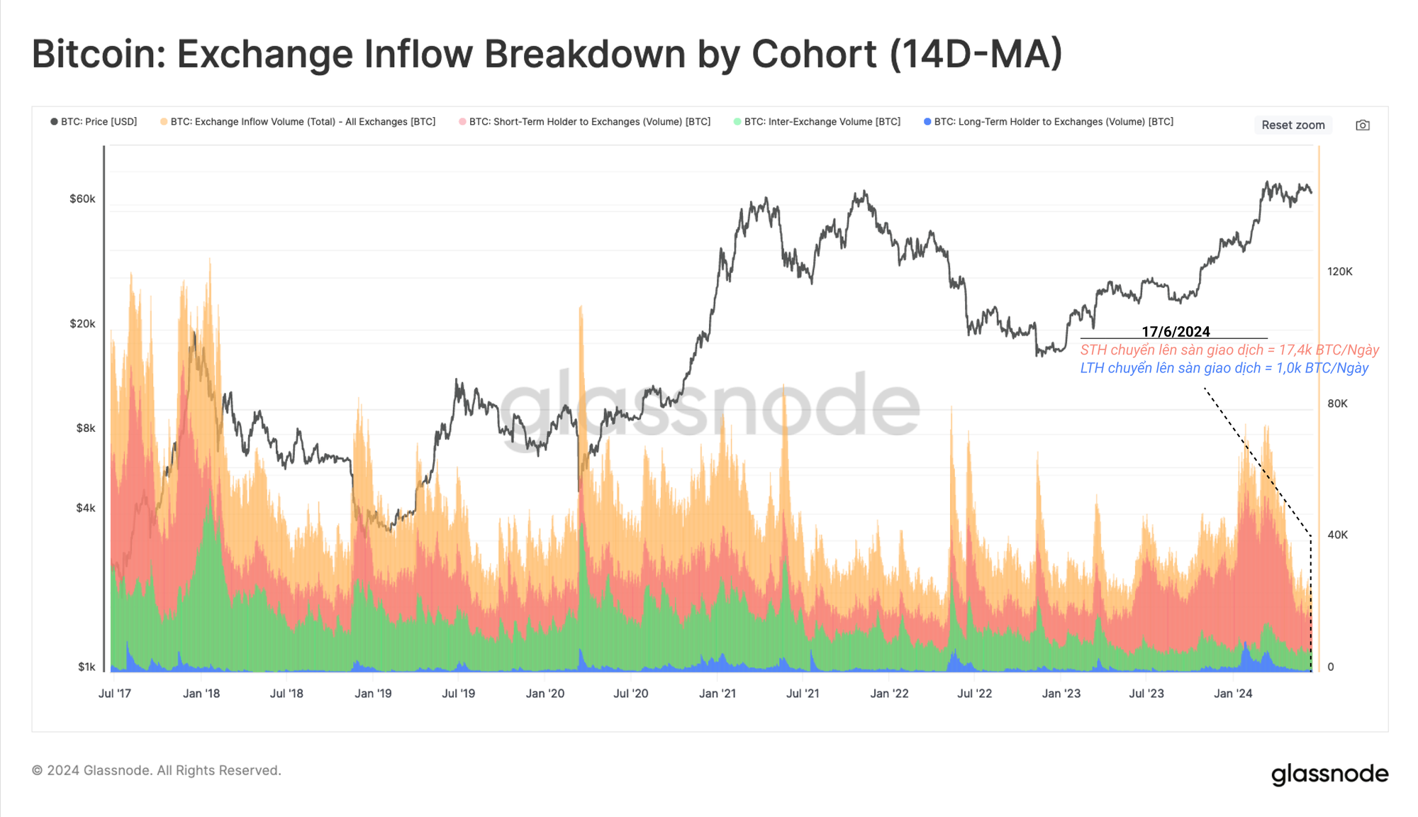 Hiện tại, những người nắm giữ ngắn hạn đang gửi khoảng +17,4k BTC/ngày tới các sàn giao dịch. Tuy nhiên, con số này thấp hơn rõ rệt so với mức đỉnh +55k BTC/ngày được ghi nhận khi thị trường đạt mức ATH 73.000 USD vào tháng 3, khi mức độ đầu cơ đã trở nên quá mức. Ngược lại, phân phối từ Người nắm giữ dài hạn vào các sàn giao dịch tương đối thấp, hiện tại chỉ có dòng tiền vào là +1k BTC/ngày.