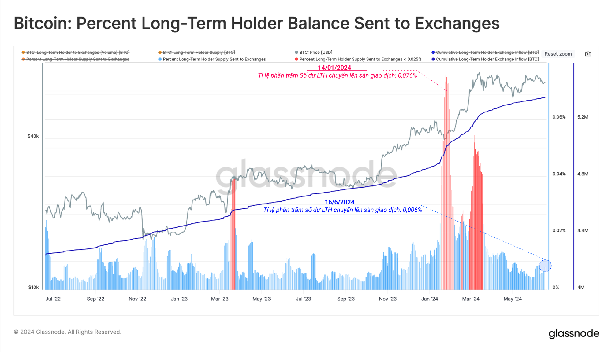 Chúng tôi có thể trực quan hoá sự sụt giảm nghiêm trọng trong hoạt động của nhà đầu tư LTH thông qua tỷ lệ phần trăm số dư của Người nắm giữ dài hạn được gửi lên các sàn giao dịch.