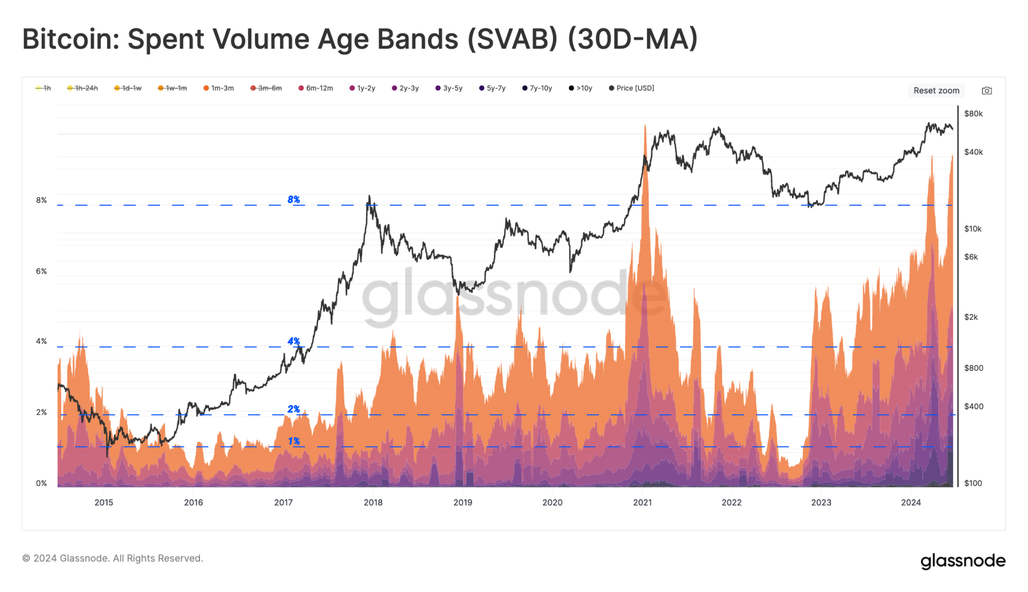 - Quan sát hành vi chi tiêu của những người nắm giữ dài hạn, có thể thấy rằng mặc dù khối lượng chi tiêu của nhóm này chỉ chiếm 4%-8% tổng khối lượng nhưng lợi nhuận thu được thường chiếm 30%-40% lợi nhuận tích lũy được hiện thực hoá trong thị trường tăng giá. Phát hiện này nhấn mạnh sự tập trung tài sản trong các đồng coin cũ hơn dần dần mang lại lợi nhuận cho các tay cứng trong thị trường tăng giá.