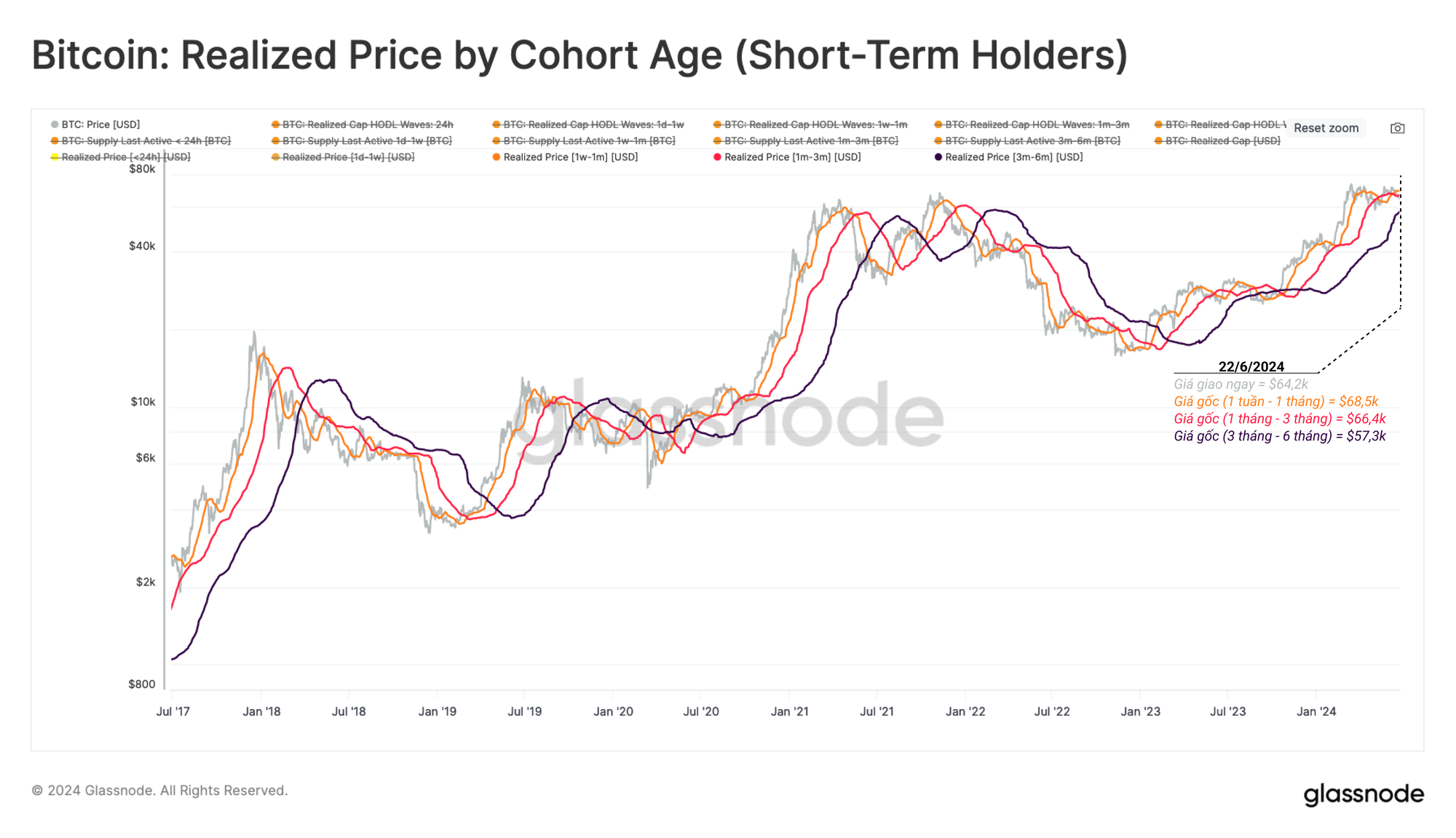 - Giá thực tế LTH 1,5 🟠 mô tả giai đoạn phục hồi từ giai đoạn cân bằng dài hạn hơn của xu hướng tăng. Giá có xu hướng tăng trưởng chậm hơn và LTH nắm giữ lợi nhuận chưa thực hiện trung bình vào khoảng +50%.