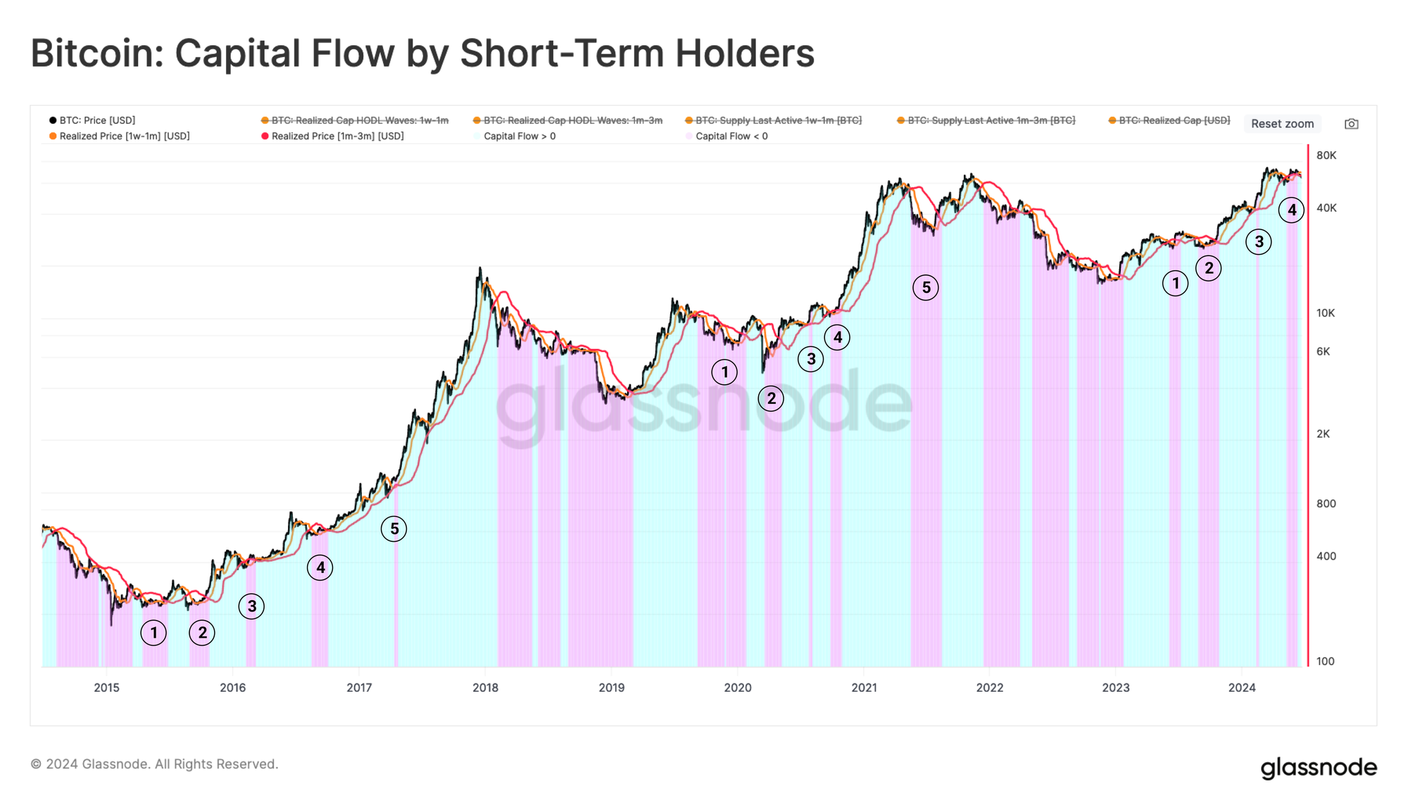 - Dòng vốn ra 🟪 khi cơ sở chi phí của những người nắm giữ 1 tuần-1 tháng giảm xuống dưới cơ sở chi phí 1 tháng-3 tháng. Cấu trúc này báo hiệu động lượng giảm dần ở phía cầu và dòng vốn ròng chảy ra khỏi tài sản.