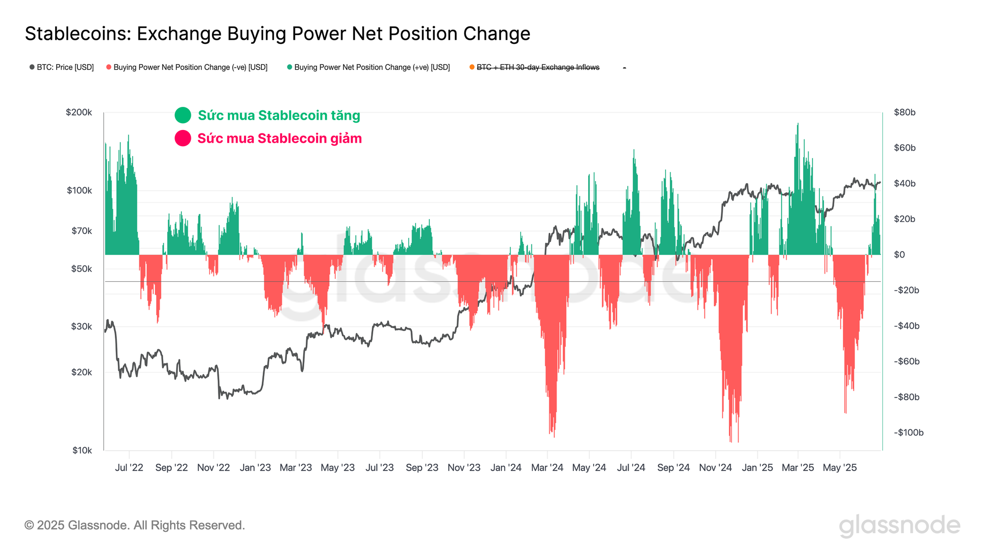 Một cách khác để đánh giá sức mạnh tương đối của sức mua stablecoin là thông qua số liệu Sức mua sàn giao dịch. Số liệu này ghi lại sự thay đổi 30 ngày trong nguồn cung stablecoin chính trên các sàn giao dịch trừ đi sự thay đổi 30 ngày tính theo USD của dòng tiền BTC và ETH. Chúng ta có thể xem xét theo khung tham chiếu sau: