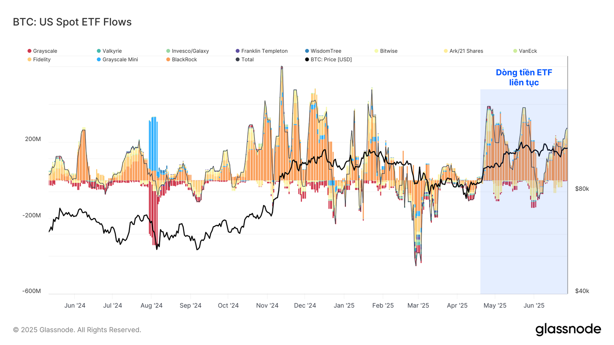 Dòng tiền ròng tổng hợp đã tăng tốc trong những tuần gần đây, đạt mức đỉnh trung bình 7 ngày là +298 triệu USD. Áp lực mua vào đáng kể và liên tục này là một tín hiệu mang tính xây dựng, làm nổi bật sự tham gia ngày càng tăng của các tổ chức ở quy mô lớn.