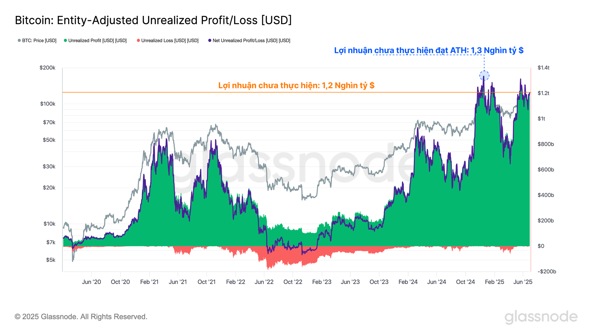 - Sau khi giá phục hồi lên $107k, phần lớn các nhà đầu tư Bitcoin đang nắm giữ lợi nhuận chưa thực hiện. Tổng lợi nhuận chưa thực hiện được nắm giữ bởi các nhà đầu tư hiện ở mức đáng kinh ngạc là 1,2 nghìn tỷ USD.