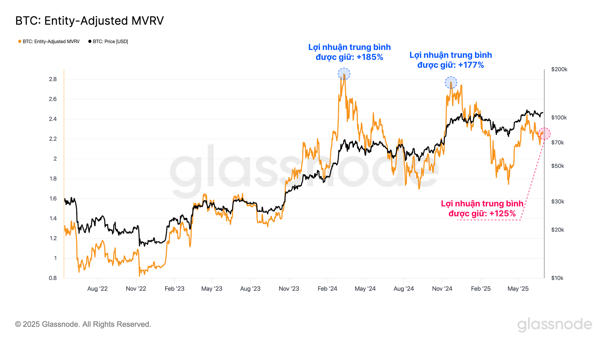 Hiện tại, mức lãi trung bình trên giấy tờ mà mỗi nhà đầu tư nắm giữ là +125%, cho thấy các nhà đầu tư Bitcoin đang nắm giữ lợi nhuận đáng kể. Con số này vẫn thấp hơn nhiều so với mức lợi nhuận +180% được ghi nhận vào tháng 3 năm 2024 khi giá đạt ATH $73k và khi thị trường vượt mốc $100k lần đầu tiên vào tháng 12 năm 2024.
