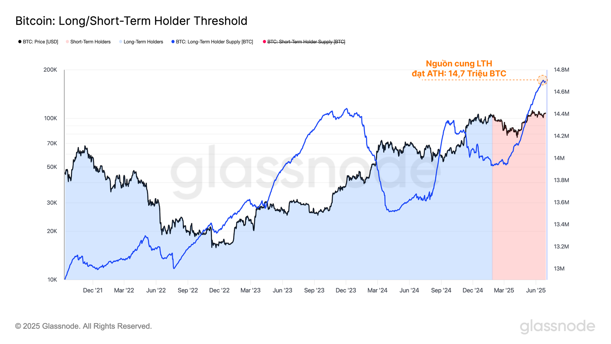 Sự suy giảm áp lực bán đặc biệt rõ ràng khi xem xét tổng nguồn cung được nắm giữ bởi nhóm Người nắm giữ dài hạn (LTH), nguồn cung này gần đây đã đạt mức cao kỷ lục mới là 14,7 triệu BTC. Điều này nhấn mạnh rằng HODLing vẫn là hành vi thị trường chủ đạo của các nhà đầu tư, với dòng tiền tích lũy và trưởng thành vượt trội hơn đáng kể so với áp lực phân phối.