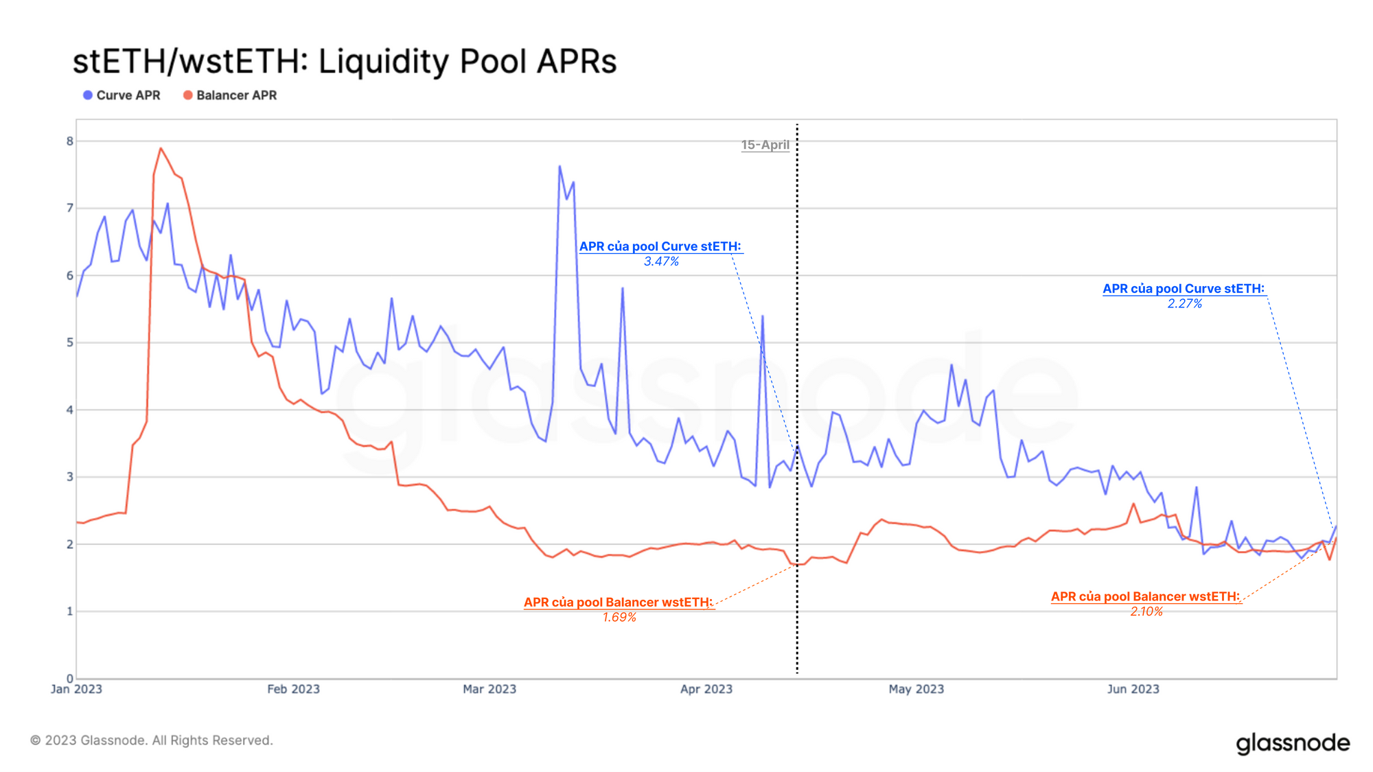 Bằng cách kiểm tra tỷ suất lợi nhuận hàng năm (APR) của cả hai pool, chúng ta có thể thấy xu hướng giảm nhất quán đã được thiết lập vào năm 2023. Đối với phân tích của mình, chúng tôi lấy ngày 15 tháng 4 làm điểm tham chiếu vì đó là khoảng thời gian khi làn sóng tiền gửi staking mới bắt đầu, cũng như sự sụt giảm thanh khoản trên các sàn DEX liên quan.