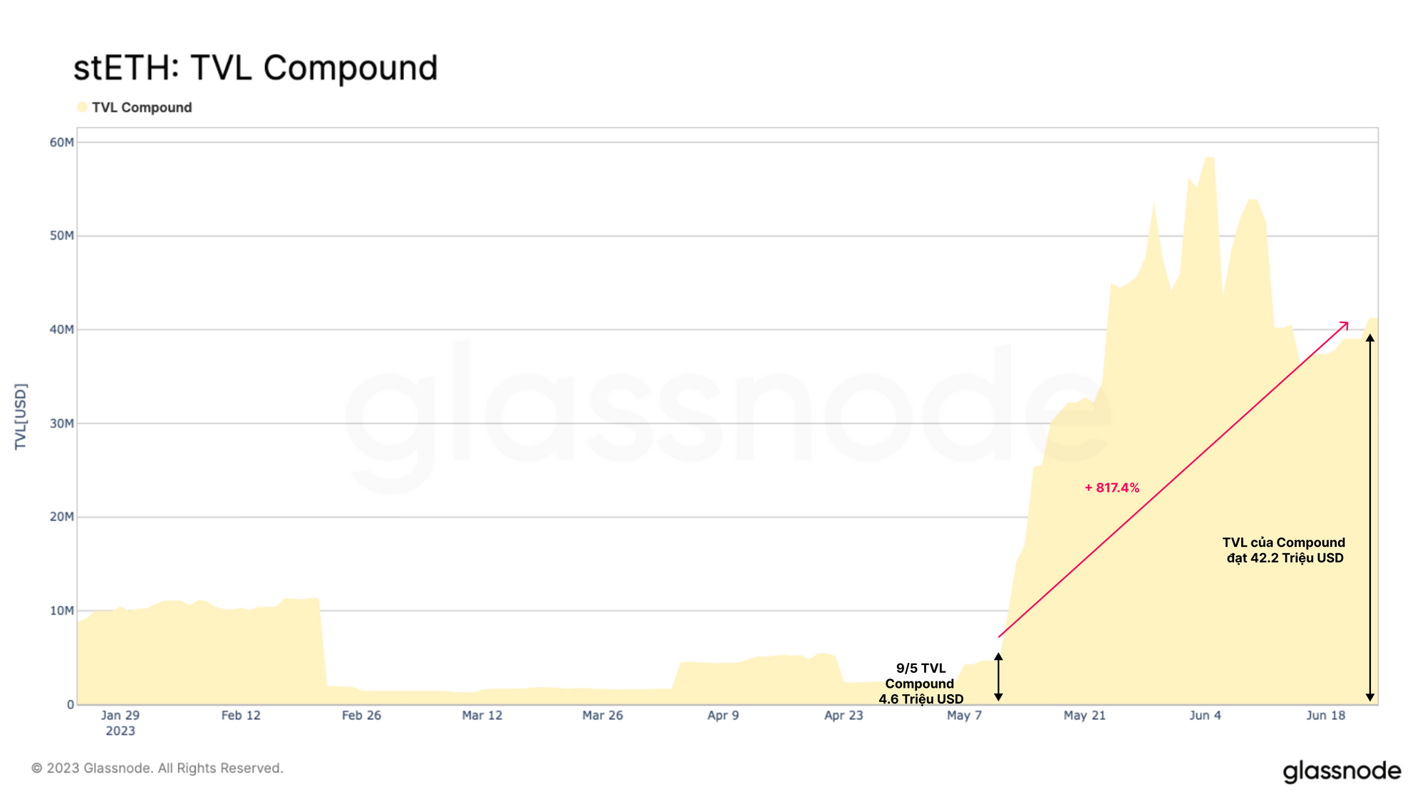 Pool wstETH V3 của Compound cũng đã chứng kiến sự tăng trưởng đáng kể kể từ khi ra mắt vào đầu năm nay, hiện đang nắm giữ stETH trị giá hơn 42.2 triệu đô la. Đây là mức tăng 817% chỉ tính riêng từ ngày 9 tháng 5. Các công cụ phái sinh staking mang lại lợi nhuận dường như đang trở thành một tài sản thế chấp hấp dẫn hơn so với ETH và thậm chí là cả stablecoin.