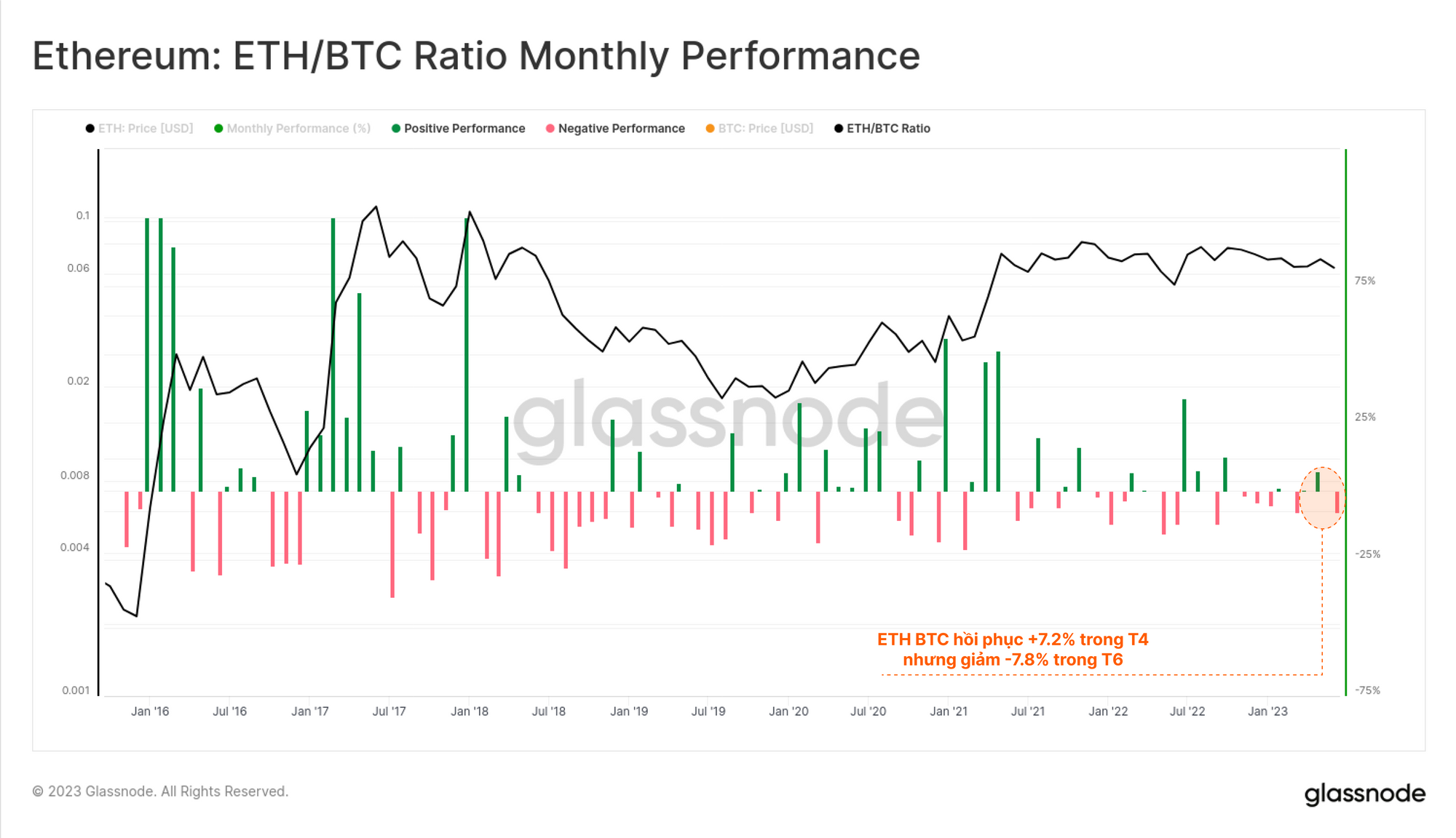 Trên cơ sở tương đối, nhiều tài sản kỹ thuật số đã giảm sức mạnh so với Bitcoin vào năm 2023, với tỷ lệ ETH/BTC trượt xuống mức thấp nhất trong 50 tuần là 0.060. Tuy nhiên, tỷ lệ này đã tăng trở lại 0.063, cho thấy một sự hồi phục vào đầu tháng 7.