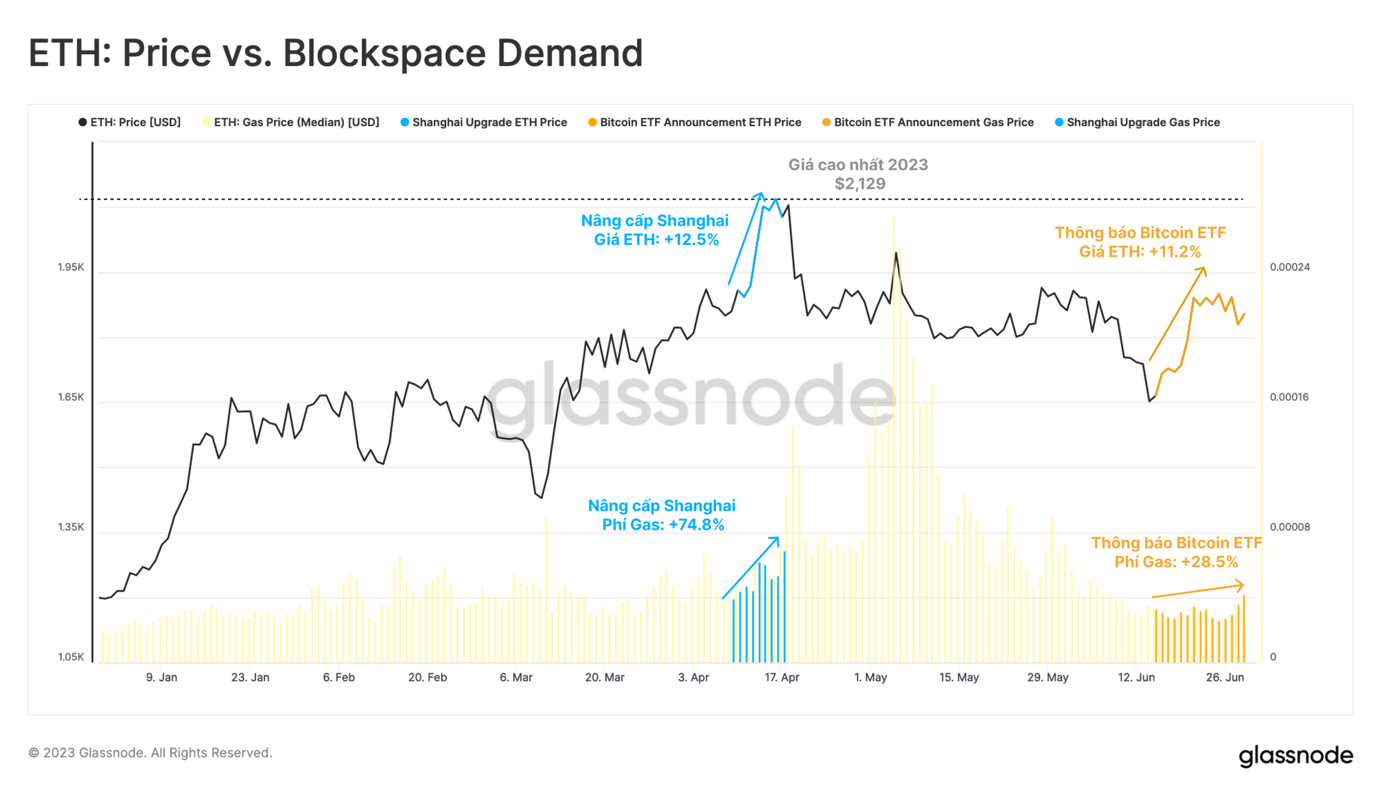 Cho đến hiện tại, việc ETH tăng giá vẫn chưa chuyển thành sự gia tăng đáng kể trong hoạt động mạng. Phí gas, được coi là đại diện cho nhu cầu dung lượng khối, vẫn tương đối thấp, đặc biệt là trong tuần tiếp theo sau các thông báo về việc nộp đơn ETF. Để so sánh thì trong giai đoạn nâng cấp Shanghai vào tháng 4, trước đợt tăng giá tương tự trên thị trường ETH, phí gas đã tăng 78%, so với mức 28% trong tuần này.