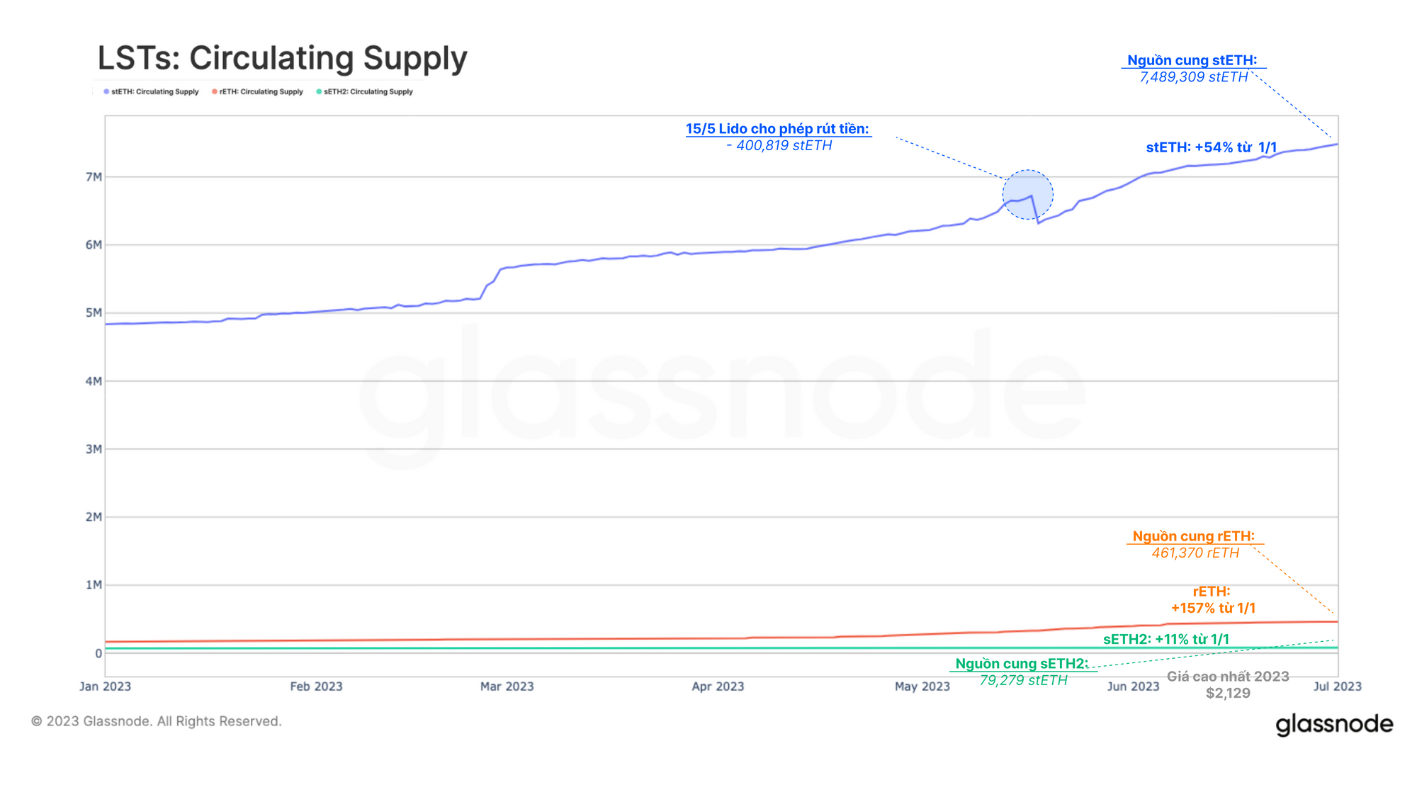 Lido đã phát hành bản cập nhật V2 vào ngày 15 tháng 5, cho phép các node vận hành rút ETH đã stake, những người nắm giữ token stETH của Lido có thể đổi lấy ETH. Sau cập nhật, đã có một giao dịch mua lại 400k stETH (721 triệu đô la), dẫn đến nguồn cung stETH bị thu hẹp. Tuy nhiên, làn sóng lớn tiền gửi ETH mới đã bù đắp sự sụt giảm và đẩy stETH lên mức ATH mới là 7.49 triệu.