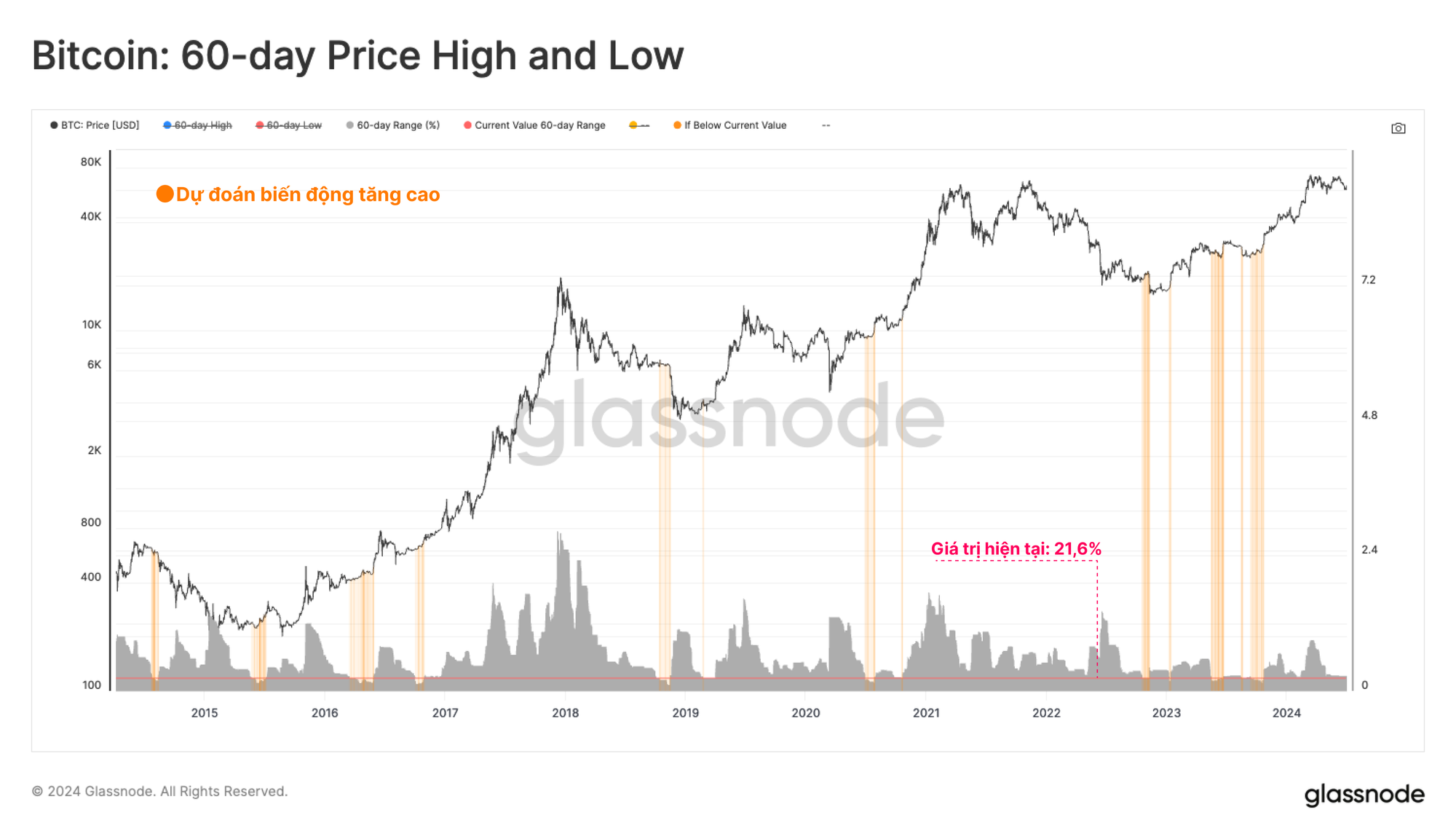Chúng tôi cũng có thể đánh giá độ biến động của thị trường bằng cách đo phạm vi phần trăm giữa mức giá cao nhất và thấp nhất trong 60 ngày qua. Theo số liệu này, sự biến động tiếp tục giảm xuống mức hiếm thấy, nhưng thường là sau những đợt củng cố kéo dài và trước những biến động lớn của thị trường.
