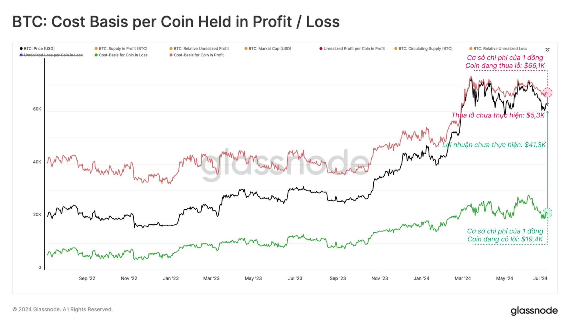 - 🔴 Trung bình mỗi BTC đang nắm giữ lợi nhuận chưa thực hiện là +$41,3k, với cơ sở chi phí khoảng 19,4k USD. Lưu ý rằng con số này sẽ bị sai lệch một phần bởi các đồng coin được di chuyển lần cuối trong các chu kỳ trước đó, bao gồm thực thể Patoshi, những người khai thác sớm và những BTC đã mất.