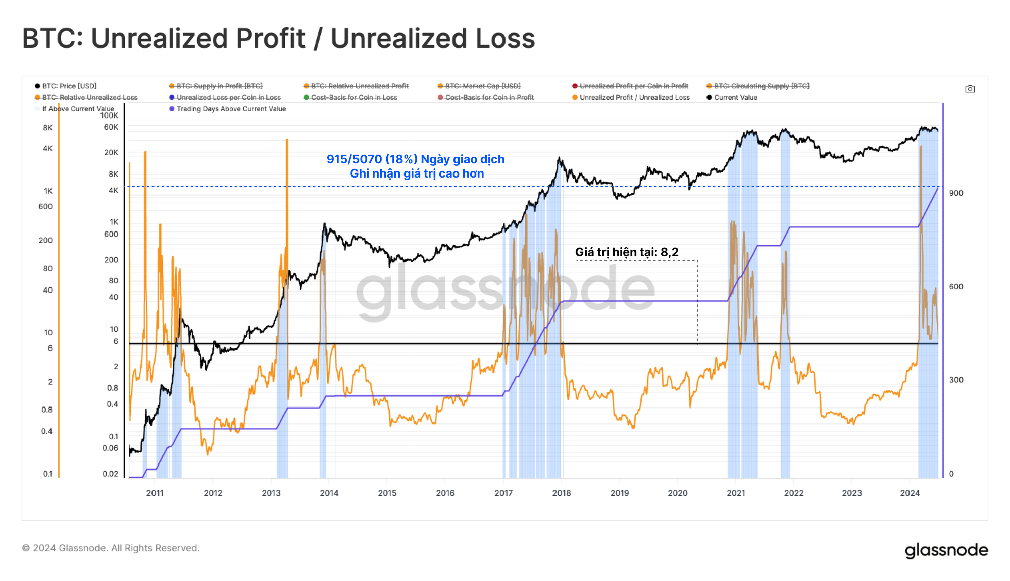 Nếu nhìn vào tỷ lệ giữa lãi/lỗ chưa thực hiện trên mỗi BTC, chúng tôi có thể thấy rằng mức độ lãi trên giấy tờ lớn hơn 8,2 lần so với lỗ trên giấy tờ. Chỉ 18% số ngày giao dịch ghi nhận giá trị tương đối lớn hơn, tất cả đều nằm trong giai đoạn hưng phấn của thị trường tăng giá.
