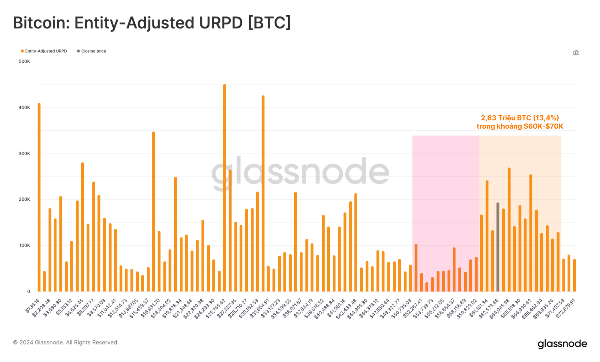 Với 2,63 triệu BTC (13,4% nguồn cung lưu hành) nằm trong cụm từ $60k đến $70k, những biến động giá nhỏ có thể ảnh hưởng đáng kể đến lợi nhuận các đồng coin và danh mục của nhà đầu tư.