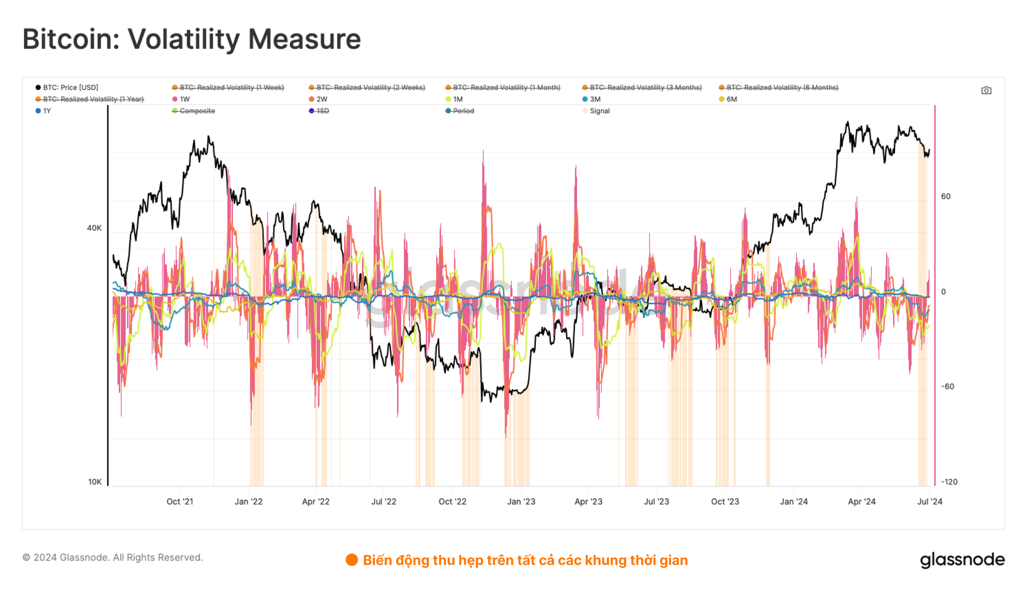Mô hình đánh giá sự thay đổi 30 ngày của Biến động thực tế trong các khung thời gian 1 tuần, 2 tuần, 1 tháng, 3 tháng, 6 tháng và 1 năm. Khi tất cả các khung thời gian thể hiện sự thay đổi 30 ngày âm, một tín hiệu sẽ được kích hoạt, cho thấy mức độ biến động đang bị nén lại.