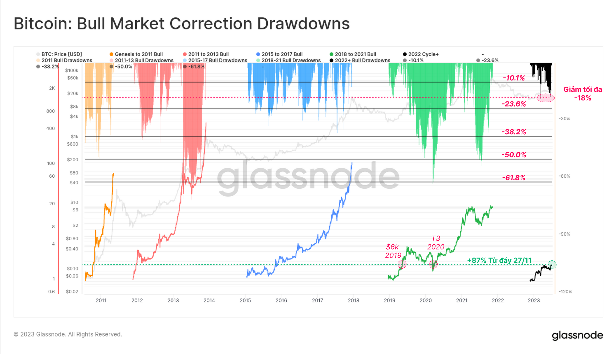 Xem xét dưới lăng kính thị trường gấu chúng ta có thể đánh giá hiệu suất năm 2023 từ ATH của chu kỳ. Thị trường đã có sự phục hồi mạnh mẽ, tăng 91% từ mức thấp nhất trong tháng 11 và có sự tương đồng đáng chú ý với các đợt phục hồi của các chu kỳ trước.